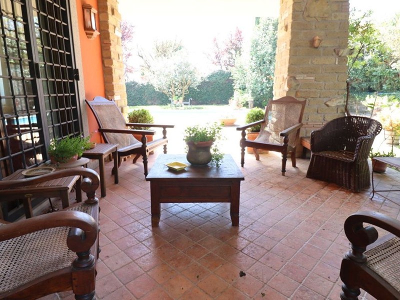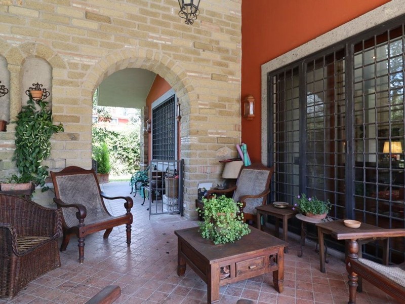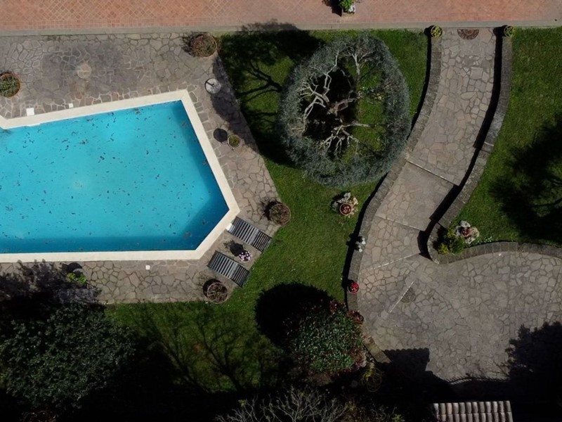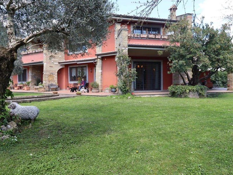 Esternamente la villa è circondata da un curatissimo giardino di circa 1000 metri quadrati, in parte a prato e in parte pavimentato nel quale sono presenti numerose piante ornamentali, ulivi e una piscina di 60 metri quadrati.