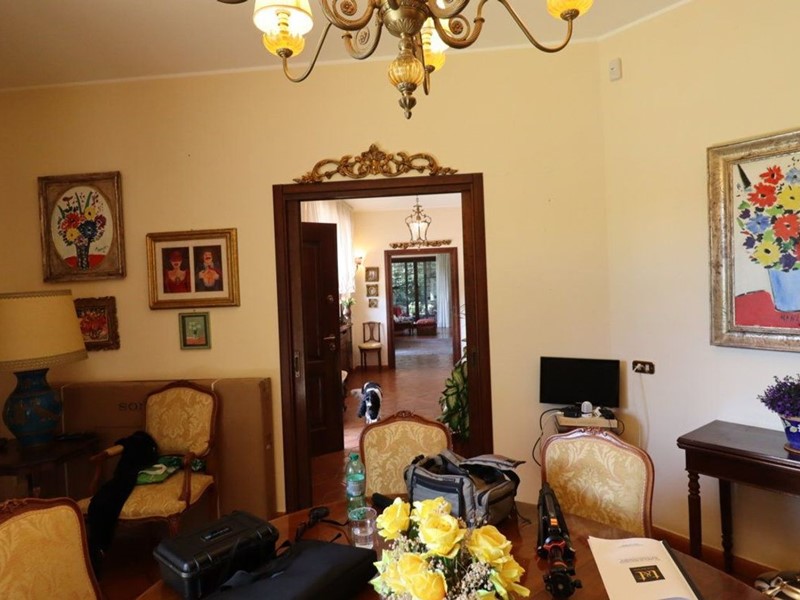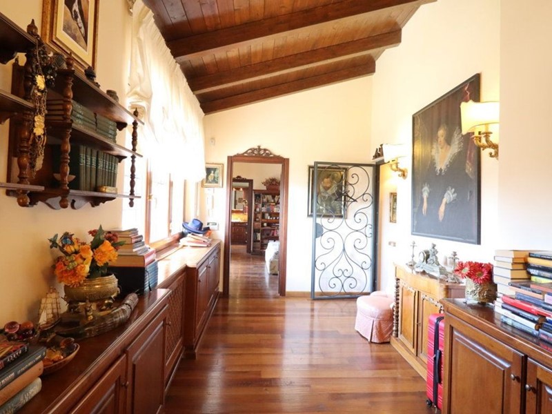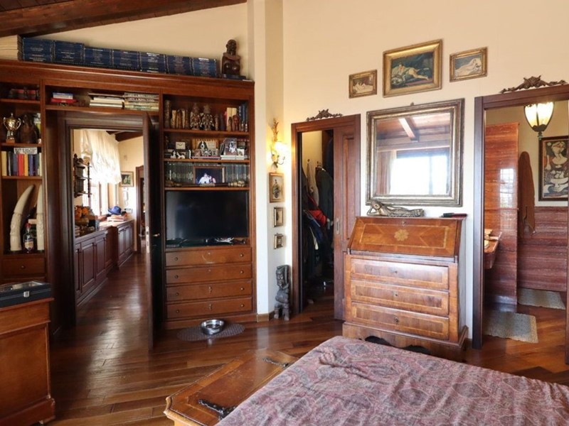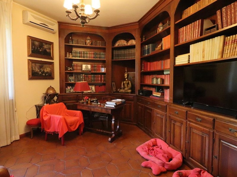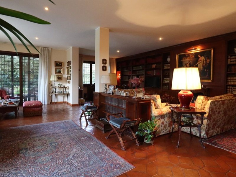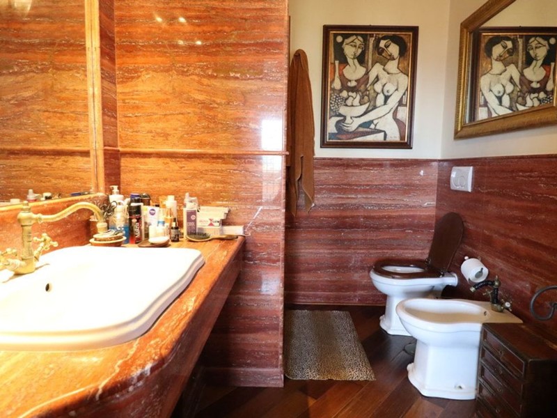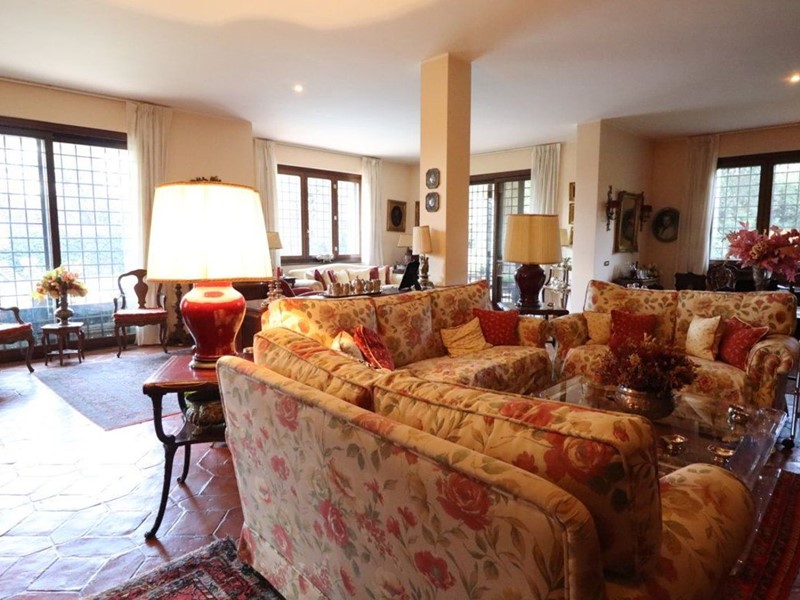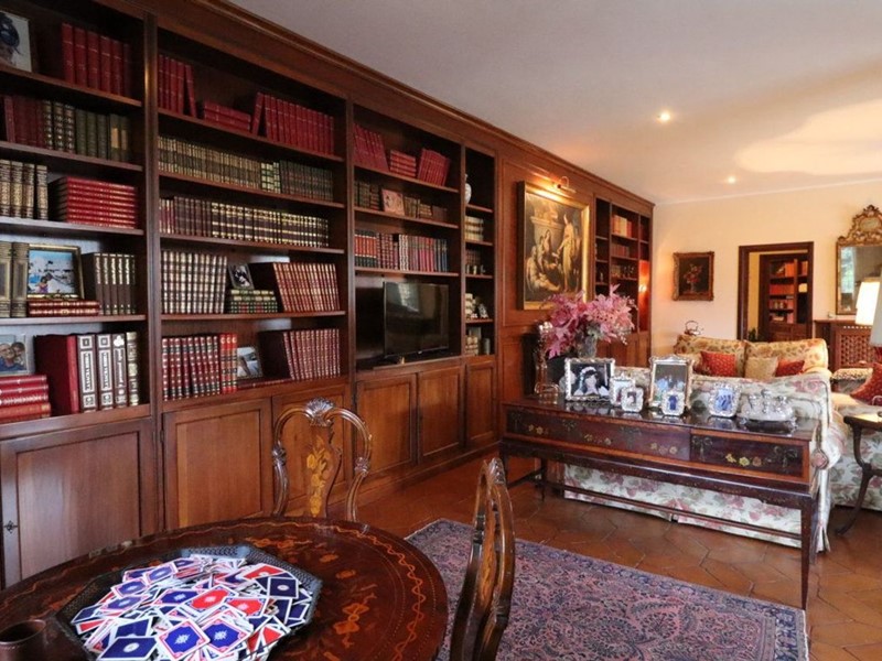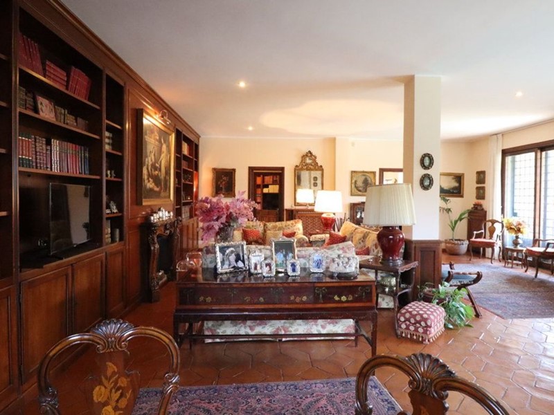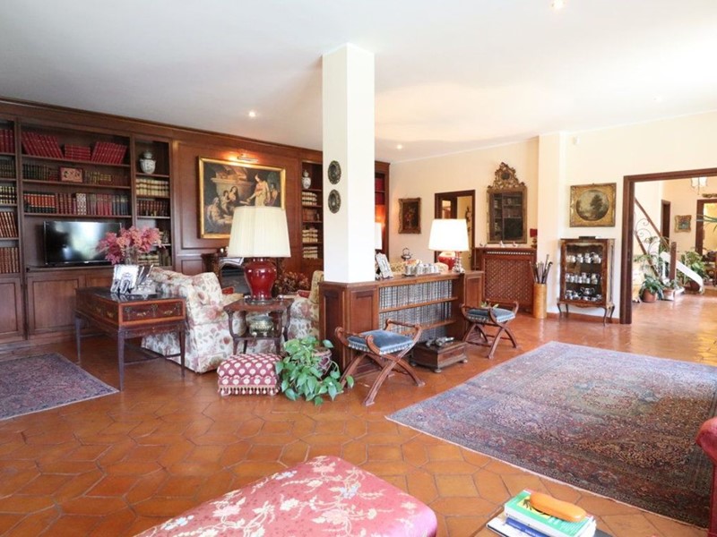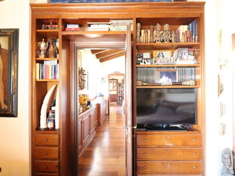Internamente, la villa si estende su una metratura complessiva di 450 metri quadrati, distribuiti su tre livelli. L'appartamento principale occupa il piano terra e il primo piano. Entrando, siamo accolti da un ampio ingresso che conduce a un salone arricchito con una una stupenda libreria con boiserie che occupa un'intera parete, un camino ed ampie vetrate che si affacciano sul giardino e la piscina. Sempre al piano terra, troviamo una cucina in muratura con affaccio sul portico, una sala da pranzo, uno studio con libreria fissa e un bagno di servizio. La pavimentazione è in cotto antichizzato lavorato a mano, mentre gli ambienti sono impreziositi da lussuose armadiature in legno pregiato. Al piano primo, invece, troviamo 4 suite, tutte con bagno privato, guardaroba e terrazzi panoramici. Gli ambienti sono impreziositi dalla presenza di travi a vista, pavimento in parquet di legno di noce e bagni rifiniti con travertino persino. L'accesso al piano seminterrato è invece possibile sia tramite scala interna che esterna. Qui troverete un comodo appartamento con ingresso indipendente, ideale per il personale di servizio, un garage di 60 metri quadrati, cantina ed intercapedine.