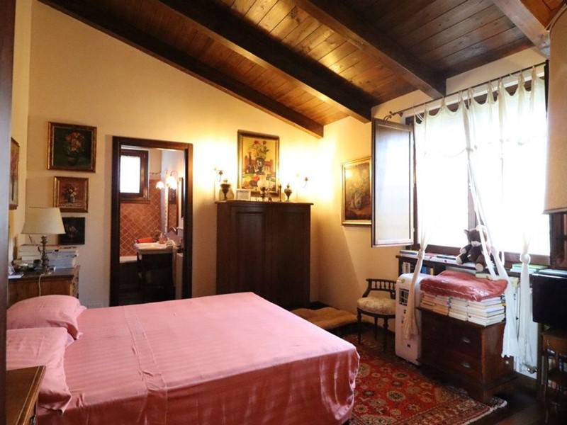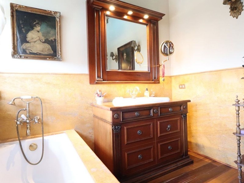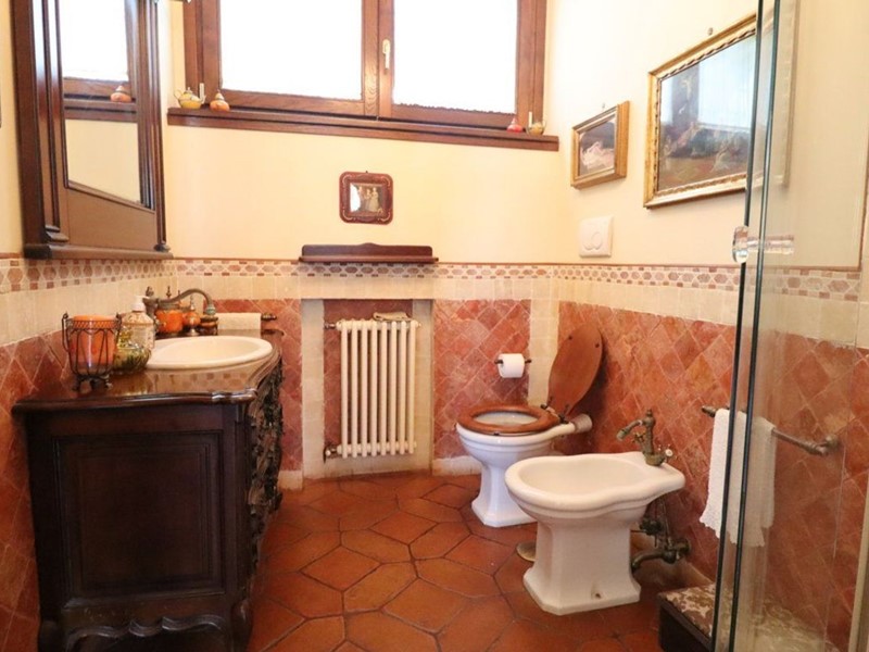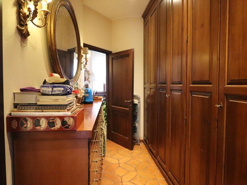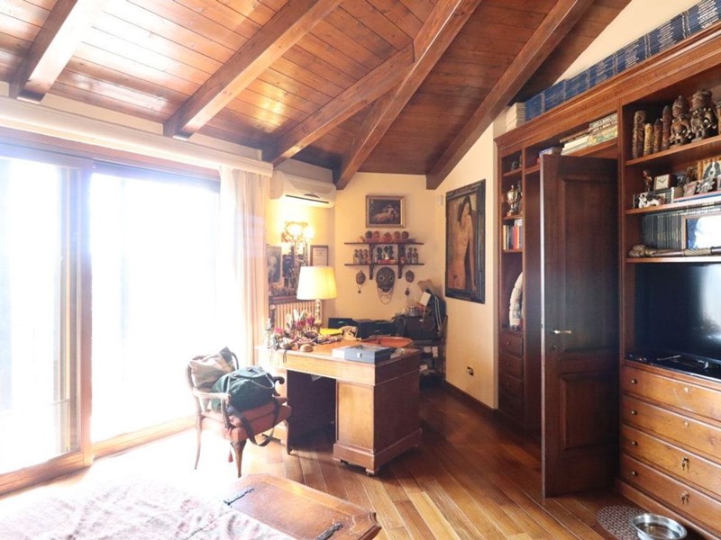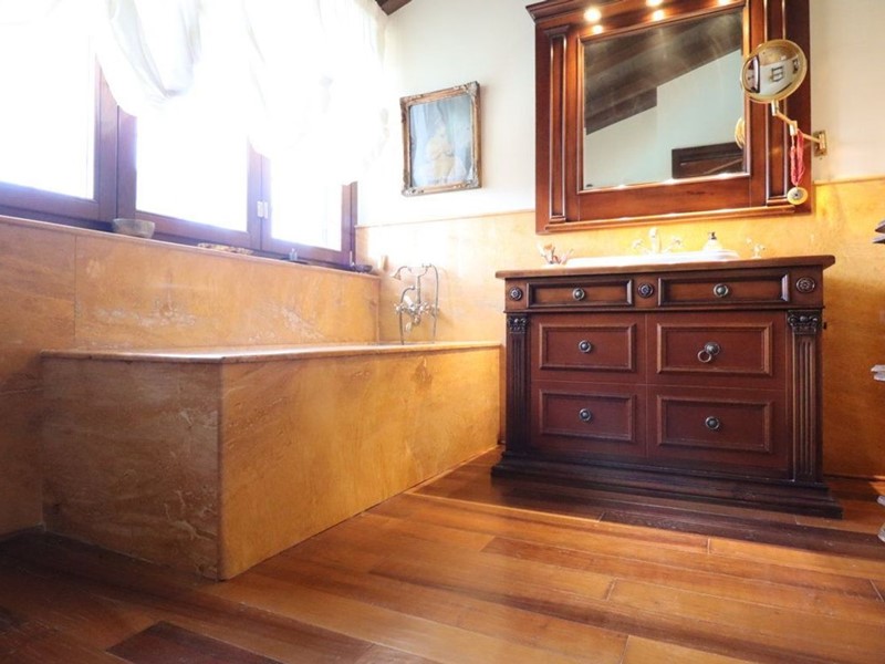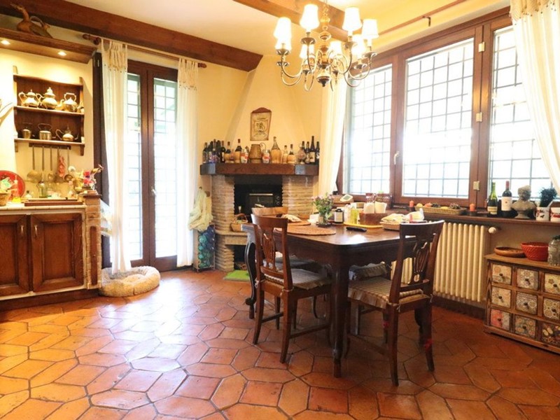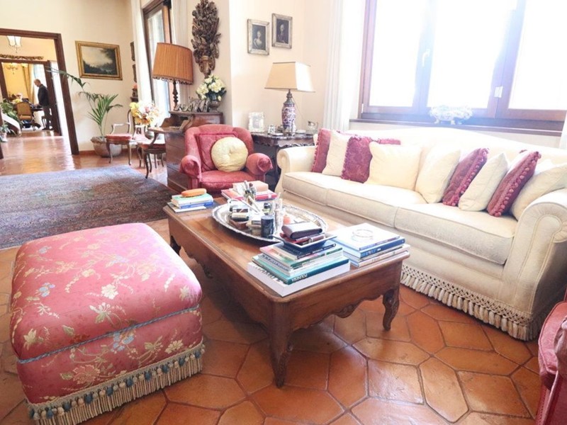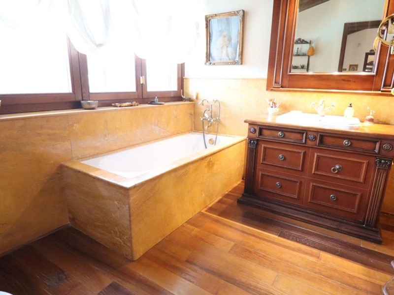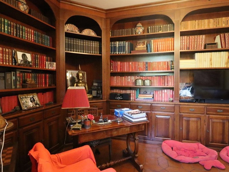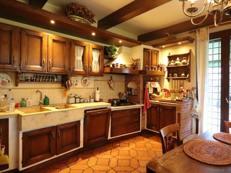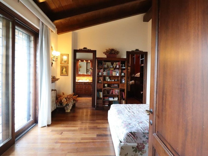 Internamente, la villa si estende su una metratura complessiva di 450 metri quadrati, distribuiti su tre livelli. L'appartamento principale occupa il piano terra e il primo piano. Entrando, siamo accolti da un ampio ingresso che conduce a un salone arricchito con una una stupenda libreria con boiserie che occupa un'intera parete, un camino ed ampie vetrate che si affacciano sul giardino e la piscina. Sempre al piano terra, troviamo una cucina in muratura con affaccio sul portico, una sala da pranzo, uno studio con libreria fissa e un bagno di servizio. La pavimentazione è in cotto antichizzato lavorato a mano, mentre gli ambienti sono impreziositi da lussuose armadiature in legno pregiato. Al piano primo, invece, troviamo 4 suite, tutte con bagno privato, guardaroba e terrazzi panoramici. Gli ambienti sono impreziositi dalla presenza di travi a vista, pavimento in parquet di legno di noce e bagni rifiniti con travertino persino. L'accesso al piano seminterrato è invece possibile sia tramite scala interna che esterna. Qui troverete un comodo appartamento con ingresso indipendente, ideale per il personale di servizio, un garage di 60 metri quadrati, cantina ed intercapedine.