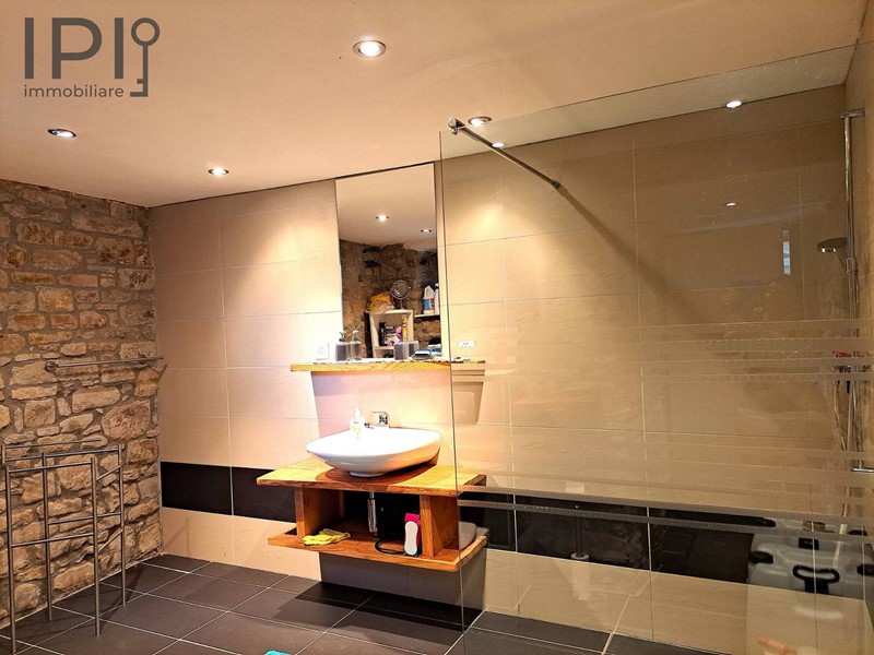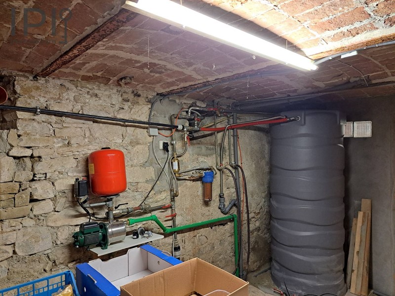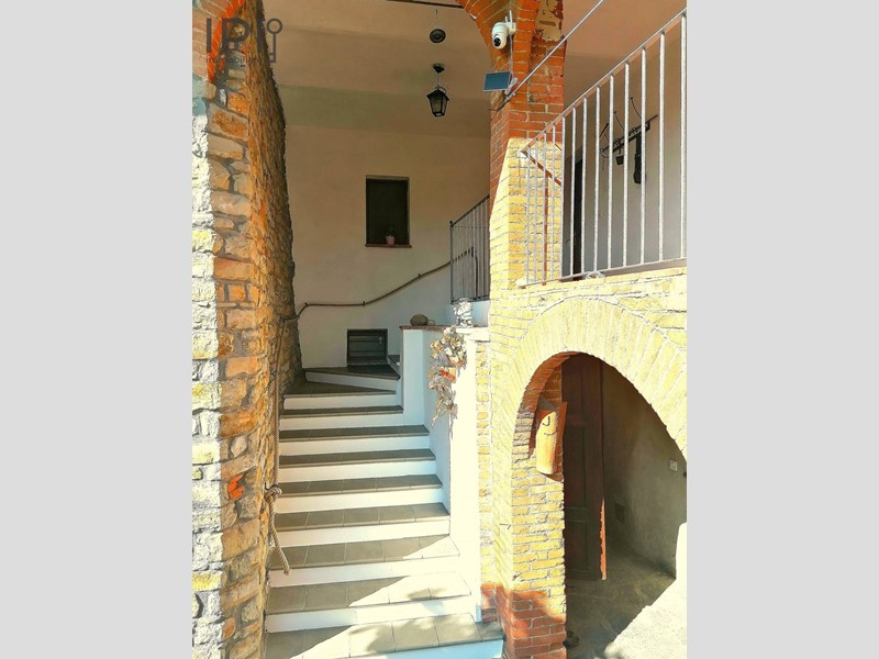 Al piano superiore, raggiungibile da scala esterna, troviamo un bellissimo loggiato ad archi in pietra che dà accesso alla parte abitativa principale con bagno, con doccia e vasca, una cucina con un sistema di riscaldamento dellacqua sanitaria tramite un bruciatore con innesco a gas che poi viene alimentato a legna.