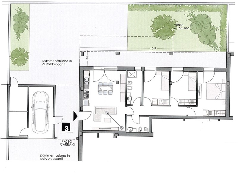 Monteveglio - Via dalla Chiesa: a ridosso del centro paese in posizione defilata ma comoda a tutti i principali servizi, appartamenti nuovi da impresa in pronta consegna. Unità 3: SLV 131mq, appartamento quadrilocale posto al piano terra con giardino privato di circa 170mq. Ingresso su soggiorno con angolo cottura, tre camere da letto di cui una matrimoniale e due singole, due bagni. In fabbricato adiacente fuori terra autorimessa, cantina e ricovero attrezzi. APE:A3, riscaldamento in pompa di calore autonoma, predisposizione impianto VMC e di condizionamento, pannelli fotovoltaici privati e dedicati ad ogni unità. Rif.DC3 Euro 360.000 oltre IVA, allaccio utenze e catastini.