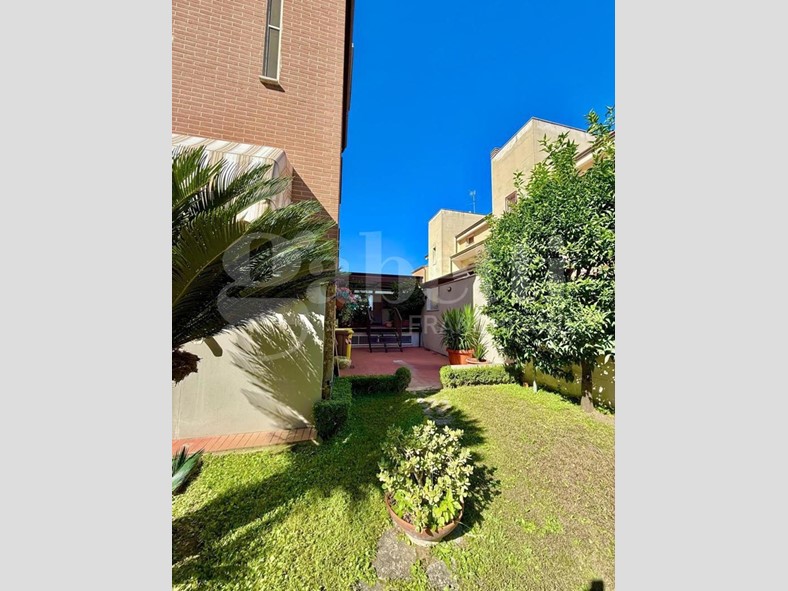 Giardino privato con impianto di irrigazione di 150 mq. circa oltre patio scoperto pavimentato di 25 mq. e doppio patio coperto di totali 60 mq.  accessibili dal giardino e dalla zona giorno del piano terra ;