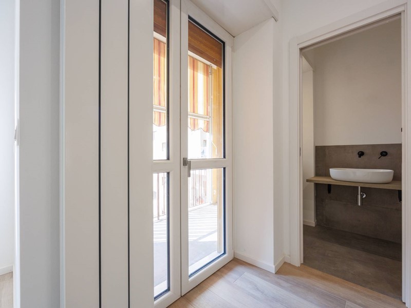Lappartamento è rifinito con materiali di alta qualità, a partire dai pavimenti, che sono stati realizzati in gres porcellanato effetto legno rovere chiaro, creando unatmosfera calda ed elegante. I serramenti in PVC monoblocco con vetri basso-emissivi selettivi garantiscono un ottimo isolamento termico e acustico.