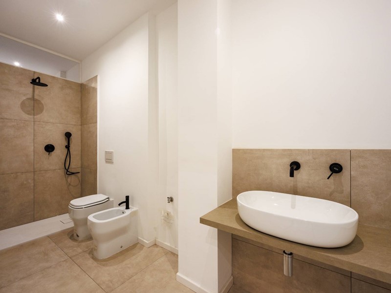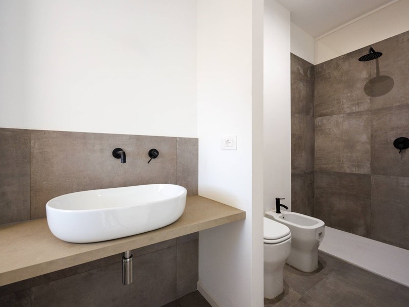 Nei bagni, le pareti sono rivestite con piastrelle in gres porcellanato. I sanitari sono a terra filo muro, mentre i piatti doccia ultraslim effetto pietra donano un tocco contemporaneo agli ambienti.
