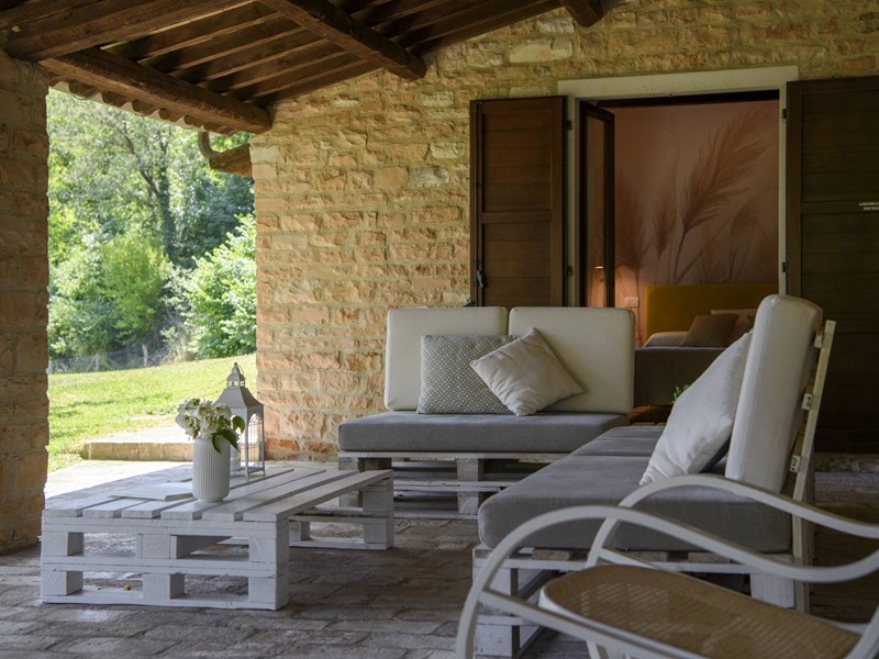 Il casale, con suggestiva facciata in pietra rosa locale, è stato oggetto di un accurato restauro che ha mantenuto elementi autentici come travi in legno a vista e pavimenti in cotto, arricchendoli con dettagli contemporanei.