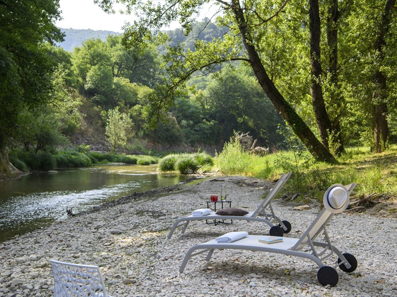 Il giardino si estende sino alla riva del fiume Candigliano, qui si trova una spiaggia privata ad uso esclusivo sulle limpide acque torrenziali, spazio unico per vivere la natura in totale privacy.