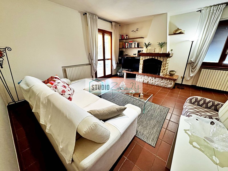L'appartamento al piano superiore presenta un ampio soggiorno con camino e un balcone che offre una vista panoramica. Una cucina abitabile, due camere da letto e due bagni completano questa affascinante unità, offrendo un'atmosfera accogliente e raffinata.