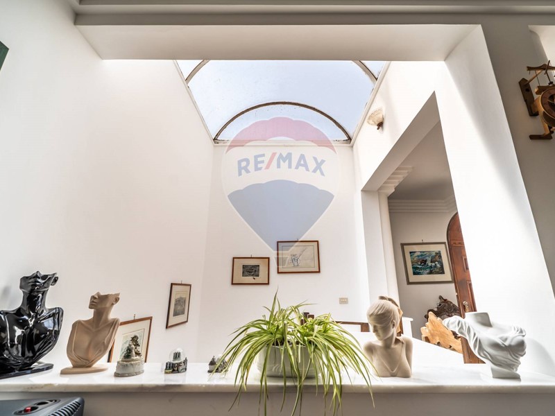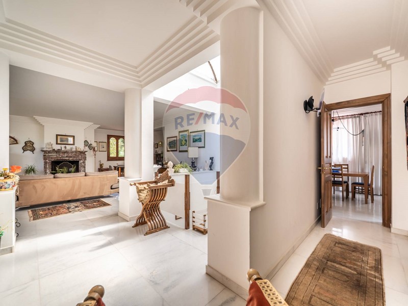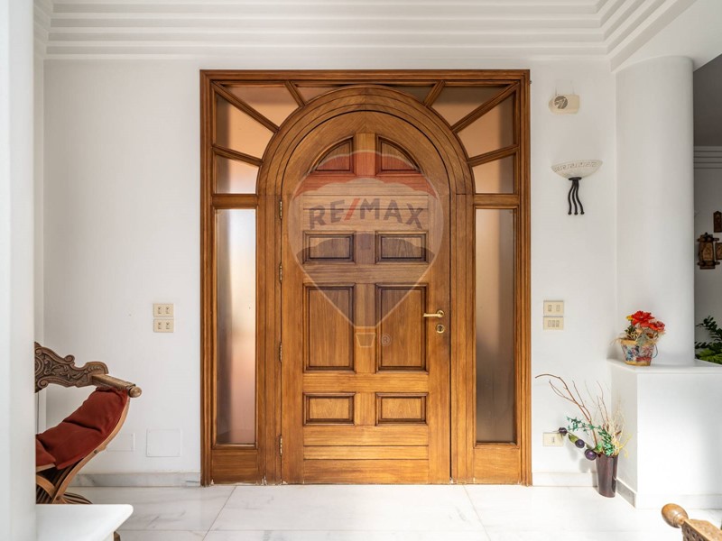Da un imponente portone in legno massello si accede all'ampio salone completato da un elegante camino che domina con il suo prezioso marmo l'intero ambiente di rappresentanza, caratterizzato dai particolari e pregiati infissi anch'essi in legno massello, creando un meraviglioso contrastano con il bianco marmo di Carrara dei pavimenti.
