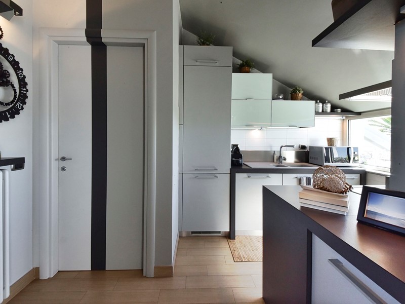 Ingresso sul soggiorno/pranzo munito di due ampi lucernari motorizzati con tendaggi oscuranti, comoda cucina a vista sul soggiorno anch'essa munita di ampio rapporto finestrato, accesso diretto all'ampio terrazzo lato sud/ovest, bagno finestrato e zona notte anch'essa munita di doppio lucernario motorizzato con relativi oscuranti.