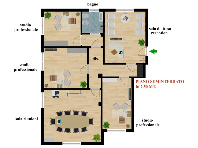 Ufficio ampio e luminoso sito al piano seminterrato di un ottimo condominio ristrutturato recentemente. Si tratta di un ampio pentavano ed è composto da: ingresso su ampia sala attesa, andito dove conduce a due comode stanze operative e una bella sala riunioni. Poi, da altro disimpegno accediamo ad un'altra stanza operativa ed al bagno completo. L'ufficio si presenta bene in buone condizioni e si può dire anche pronto all'utilizzo, è dotato di impianto di illumnazione, condizionatore canalizzato autonomo. Si arriva al piano dell'ufficio anche con l'ascensore.