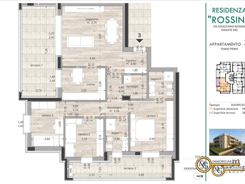 L'alloggio n.3 è una soluzione di 4 locali posizionata al primo piano con soggiorno e cucina abitabile nella zona living molto luminosa grazie ad un'ampia finestra scorrevole che offre l'accesso al terrazzo loggiato.\nIl disimpegno conduce ad un ripostiglio con attacco per la lavatrice, alla camera matrimoniale con bagno dedicato, al bagno principale ed alle due camere singole.\nUn balcone loggiato ed accessibile da due stanze completa la zona notte. - Maggiori Dettagli: Porta blindata