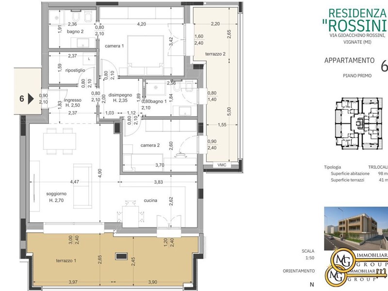 L'alloggio n.6 è una soluzione di 3 locali posizionata al primo piano con soggiorno, cucina abitabile e ripostiglio con attacco per la lavatrice nella zona living molto luminosa grazie ad un'ampia finestra scorrevole che offre l'accesso al terrazzo loggiato.\nIl disimpegno conduce alla camera matrimoniale con bagno dedicato, al bagno principale ed alla camera singola.\nUn balcone loggiato ed accessibile da tutte e due le stanze completa la zona notte. - Maggiori Dettagli: Porta blindata