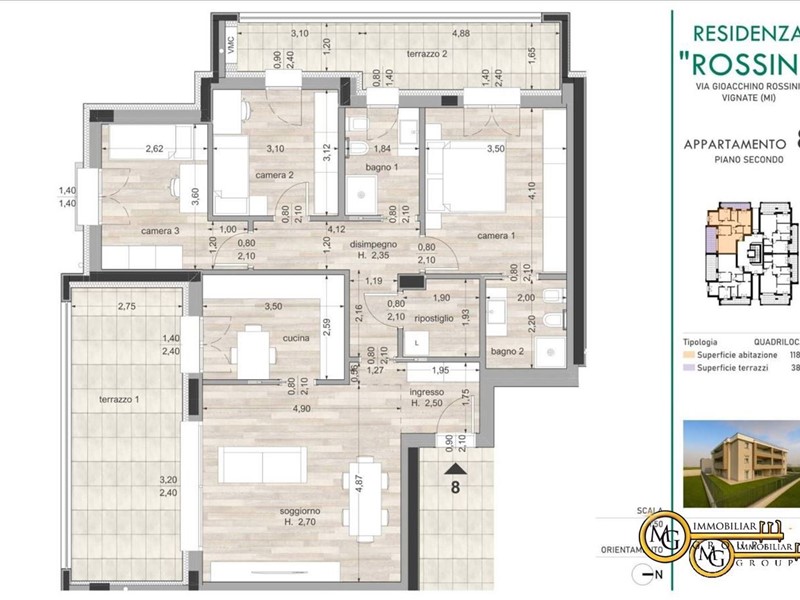 L'alloggio n.8 è una soluzione di 4 locali posizionata al secondo ed ultimo piano con soggiorno e cucina abitabile nella zona living molto luminosa grazie ad un'ampia finestra scorrevole che offre l'accesso al terrazzo loggiato.\nIl disimpegno conduce ad un ripostiglio con attacco per la lavatrice, alla camera matrimoniale con bagno dedicato, al bagno principale ed alle due camere singole.\nUn balcone loggiato ed accessibile da due stanze completa la zona notte.