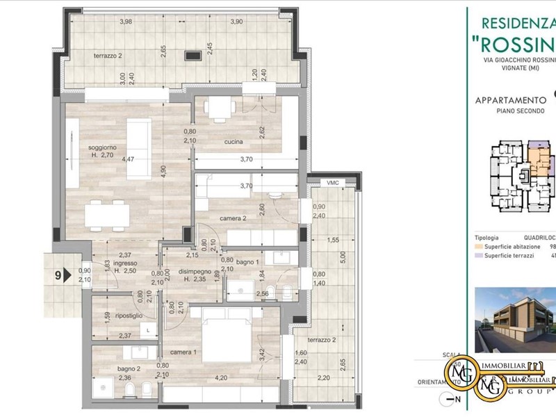 L'alloggio n.9 è una soluzione di 3 locali posizionata al secondo ed ultimo piano con soggiorno, cucina abitabile e ripostiglio con attacco per la lavatrice nella zona living molto luminosa grazie ad un'ampia finestra scorrevole che offre l'accesso al terrazzo loggiato.\nIl disimpegno conduce alla camera matrimoniale con bagno dedicato, al bagno principale ed alla camera singola.\nUn balcone loggiato ed accessibile da tutte e due le stanze completa la zona notte. - Maggiori Dettagli: Porta blindata