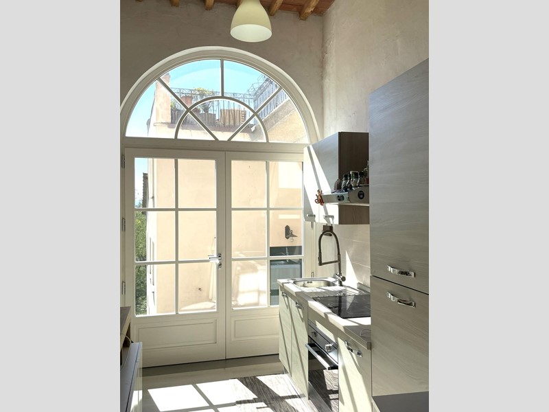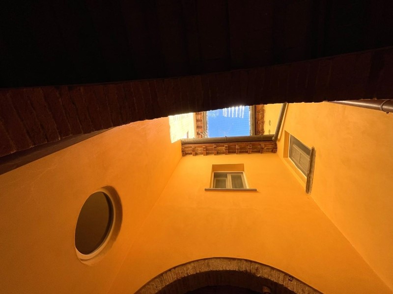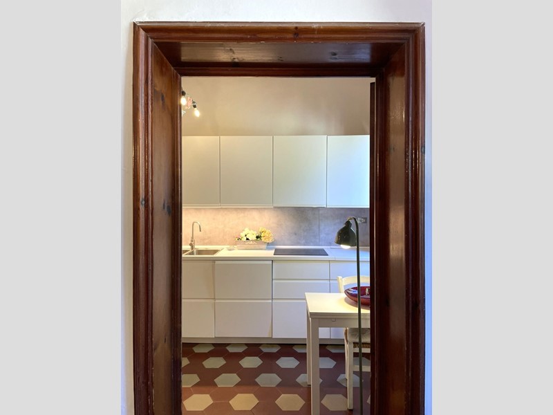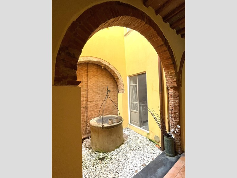 Oltre l'ingresso principale, un corridoio conduce ai vari ambienti, costeggiando una graziosa corte con pozzo che riempie di luce gli interni. In fondo al corridoio si accede al primo appartamento, che si presenta con un ampio soggiorno con zona pranzo, collegato alla zona cottura. L'appartamento comprende due camere da letto: una matrimoniale con terrazzino e una più piccola con affaccio sul cortile, oltre a un bagno con doccia.