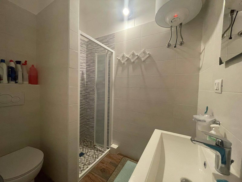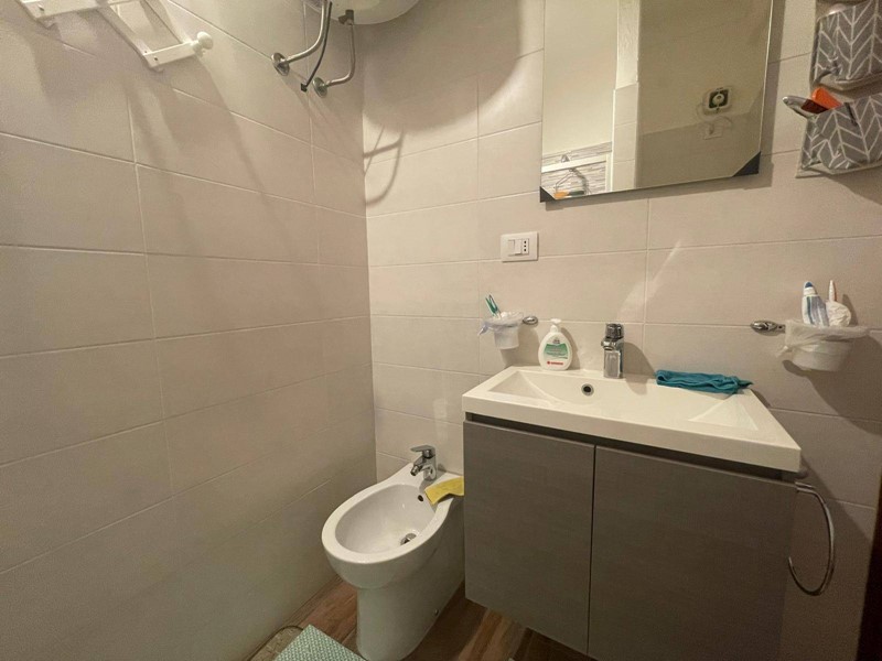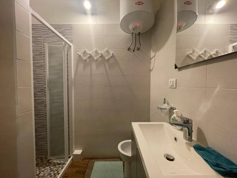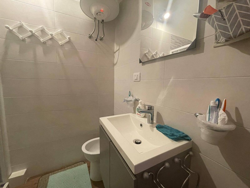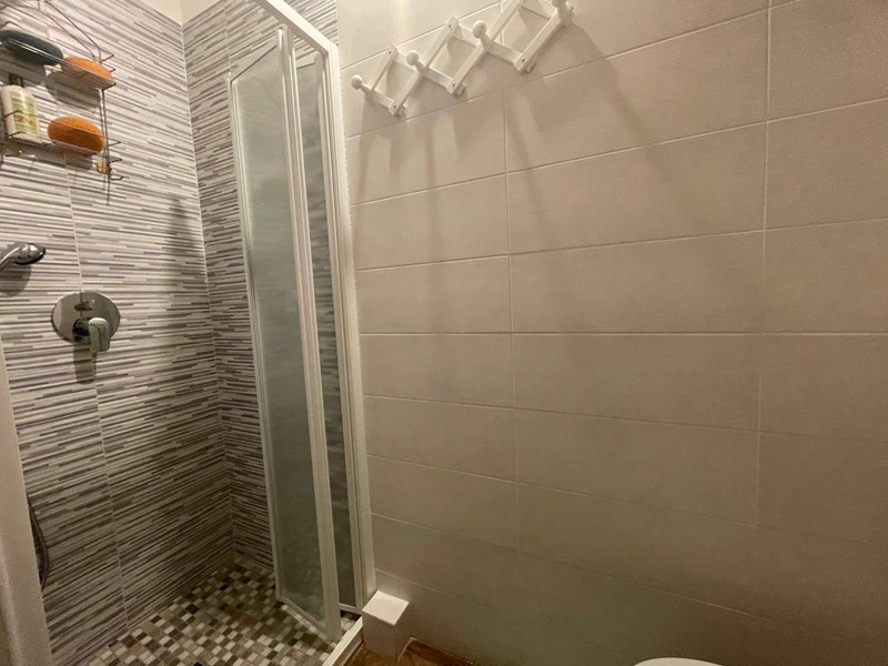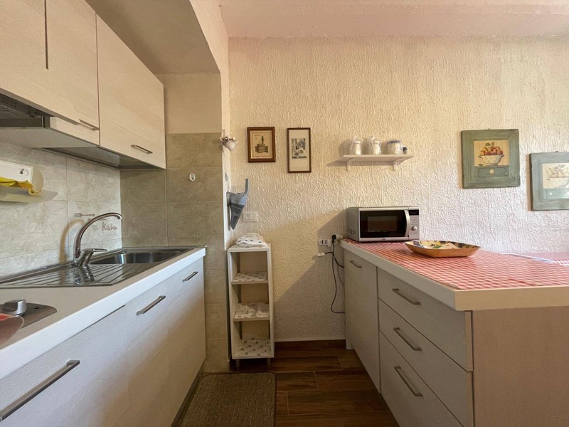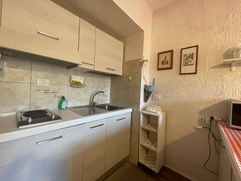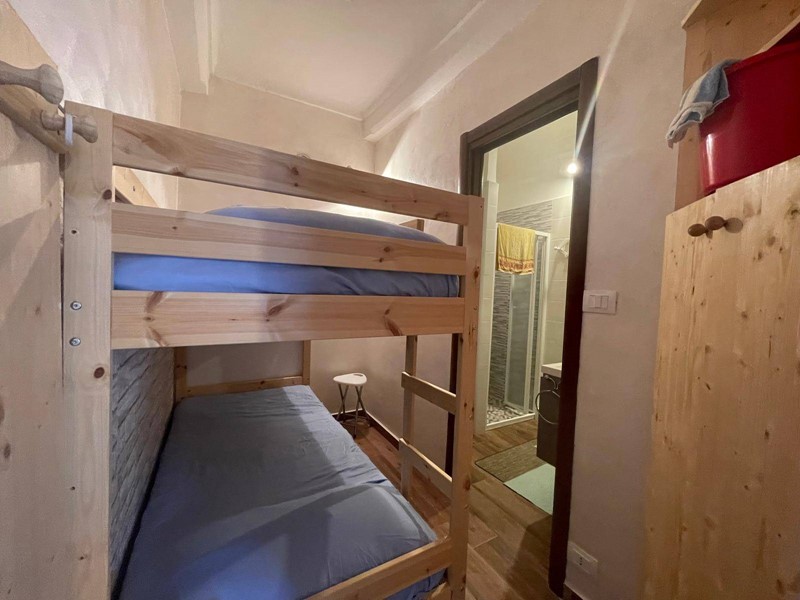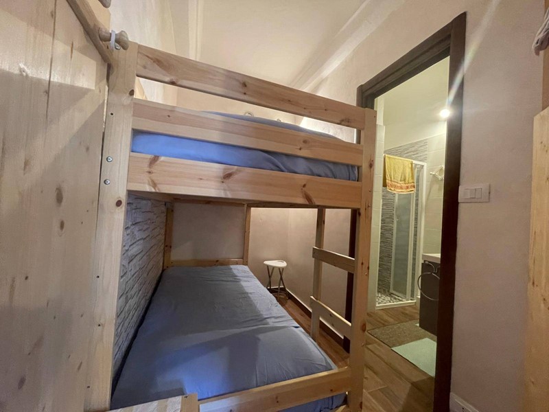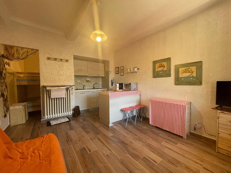 ambiente unico con cucina a vista e divano letto, disimpegno dove è stato collocato un letto a castello, bagno con doccia.