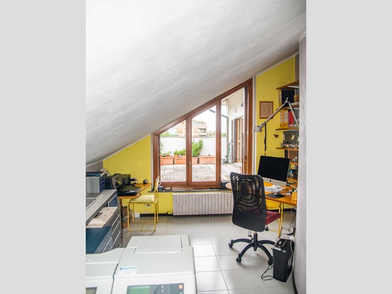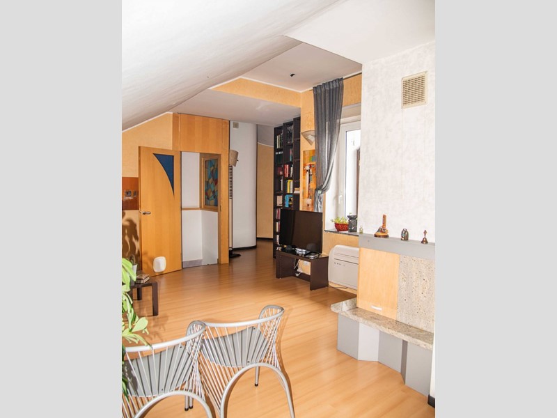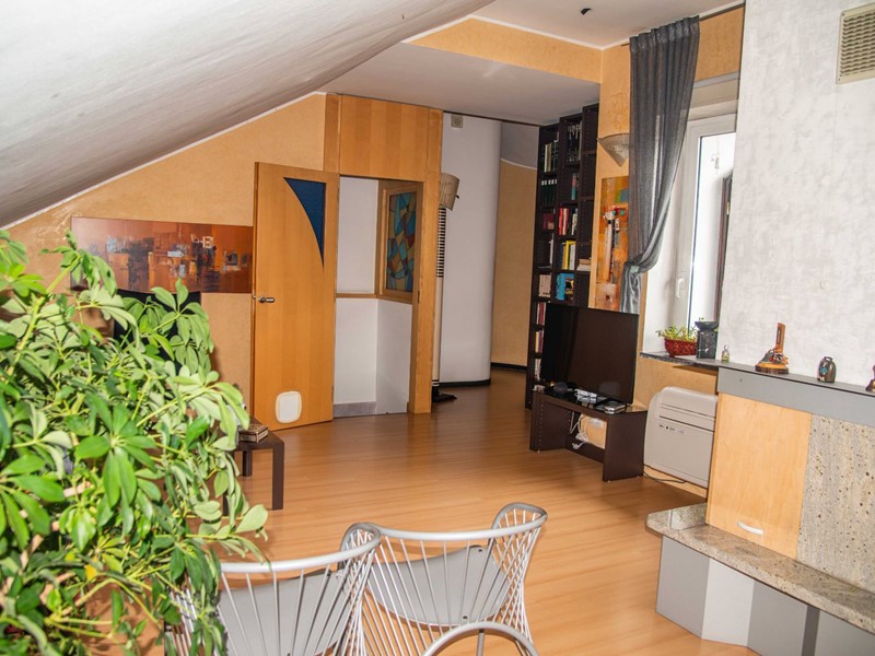 Rho zona San Carlo. In signorile condominio immerso nel verde proponiamo stupendo attico di generose dimensioni disposto su due livelli. Al piano 5° ingresso, soggiorno con zona pranzo, cucina abitabile, le due camere da letto. Due bagni finestrati ed un ripostiglio completano il piano principale. Balconi e terrazzino. Una scala interna in muratura rivestita in legno porta al piano superiore mansardato composto da un secondo soggiorno con camino, uno studio, un ripostiglio ed una lavanderia oltre ad un terrazzo di mq. 28. Completano la proprietà una cantina e la possibilità di un box singolo ed un ampio box doppio.