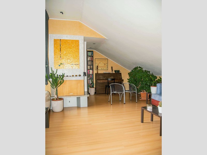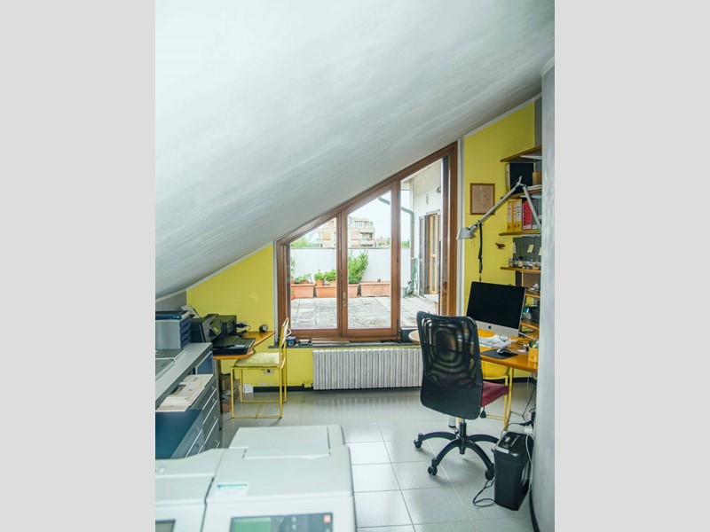 Rho zona San Carlo. In signorile condominio immerso nel verde proponiamo stupendo attico di generose dimensioni disposto su due livelli. Al piano 5° ingresso, soggiorno con zona pranzo, cucina abitabile, le due camere da letto. Due bagni finestrati ed un ripostiglio completano il piano principale. Balconi e terrazzino. Una scala interna in muratura rivestita in legno porta al piano superiore mansardato composto da un secondo soggiorno con camino, uno studio, un ripostiglio ed una lavanderia oltre ad un terrazzo di mq. 28. Completano la proprietà una cantina e la possibilità di un box singolo ed un box triplo (prezzo a parte).