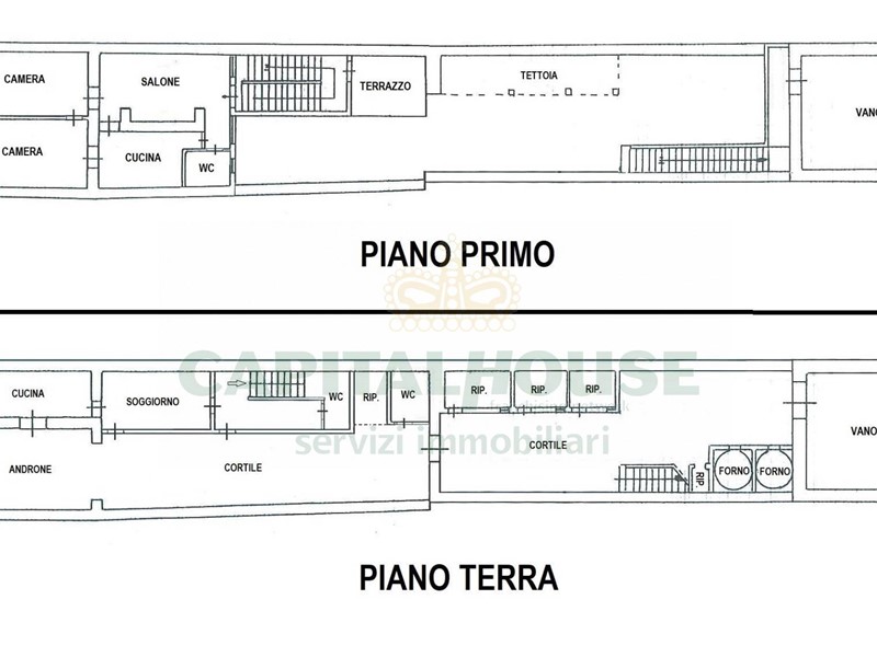 -piano terra: (40mq CALPESTABILI) cucina, soggiorno, 2 bagni + 70mq di depositi +175mq di cortile;