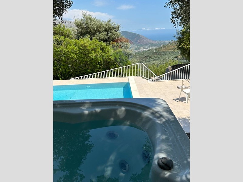 Allesterno, unoasi privata ti accoglie con una piscina panoramica, vasca jacuzzi, area relax e sauna, tutto con una vista mozzafiato sul mare e sulle colline circostanti