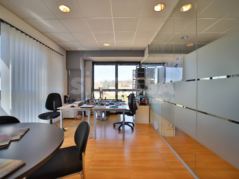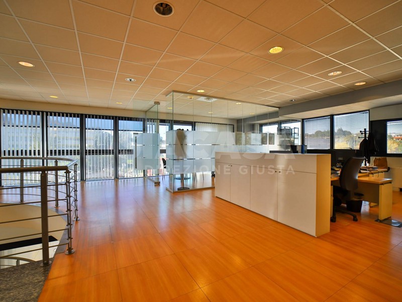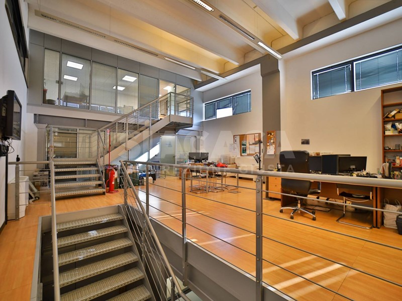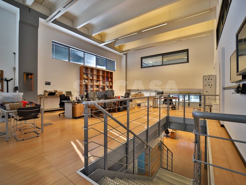 Gli ambienti interni, distribuiti su più livelli, si caratterizzano per grande luminosità e articolazione spaziale: i soppalchi interni creano suggestivi giochi di altezze e prospettive che donano movimento e profondità, permettendo di differenziare le funzioni senza interrompere la continuità visiva. Le superfici sono interamente climatizzate, riscaldate e cablate, con finiture di livello direzionale e unimpostazione pensata per coniugare immagine e operatività.