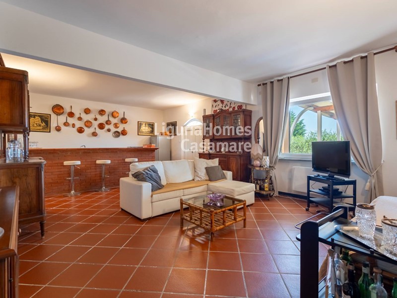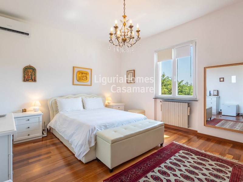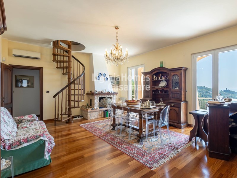 Internamente, la villa è stata completamente rinnovata secondo i più elevati standard energetici. Al piano dingresso si trovano un ampio soggiorno con accesso al terrazzo, dal quale ammirare una spettacolare vista sul mare e sul castello di Noli, una cucina, un bagno di servizio, due camere da letto e una cabina armadi, collegata tramite scala interna al piano inferiore.