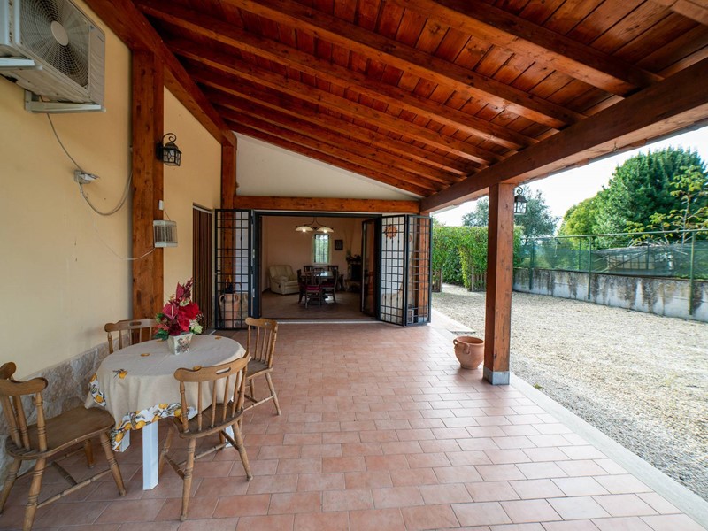 Entrando dal vialetto pedonale ci accoglie un grande portico dove troviamo la porta dingresso e un ampia finestra che dà accesso nella zona pranzo.