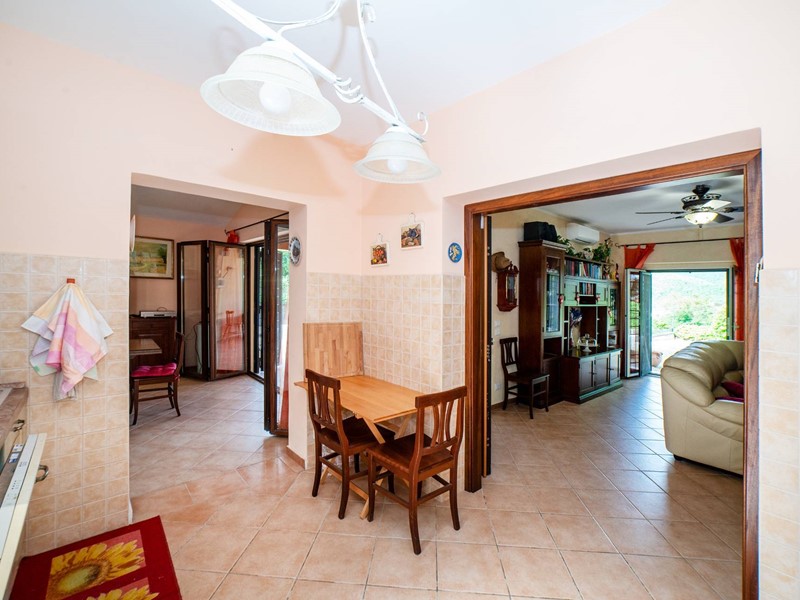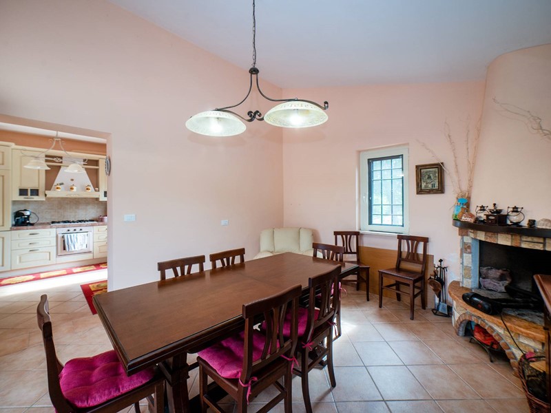 Tornando al piano terra, dal salone, tramite una grande porta, si accede alla cucina abitabile molto luminosa, la quale consente il passaggio al giardino dove regna la bellissima piscina e alla camera da pranzo.