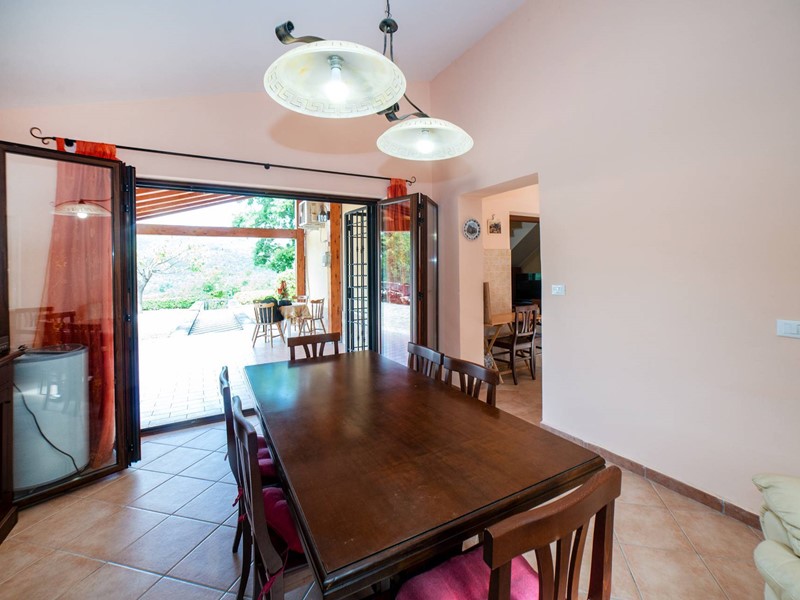 In questultimo ambiente, a fare da padrone è il camino, rendendo latmosfera calda e allo stesso tempo rustica. Al centro vi è il lungo tavolo dove potersi riunire e trascorrere momenti gioviali in compagnia di amici e parenti. Da questa stanza si accede anche dal portico e la finestra dà sulla piscina.