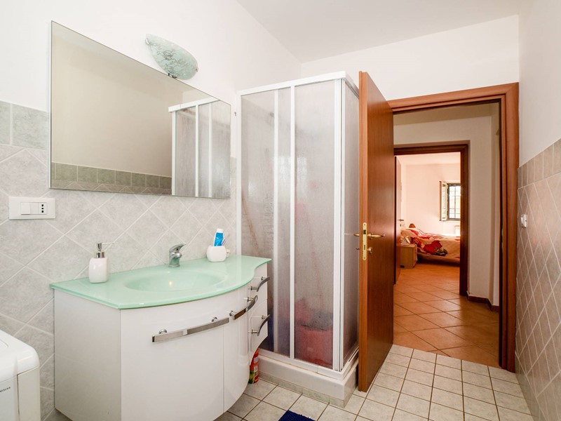La zona notte al piano terra è composta da un disimpegno dal quale si ha accesso a due camere da letto una più piccola che affaccia sul giardino antistante e una camera matrimoniale che affaccia sul retro del giardino dove troviamo la piscina. A servizio delle due camere troviamo un comodo bagno con un mobile lavabo moderno, la doccia e la lavatrice.