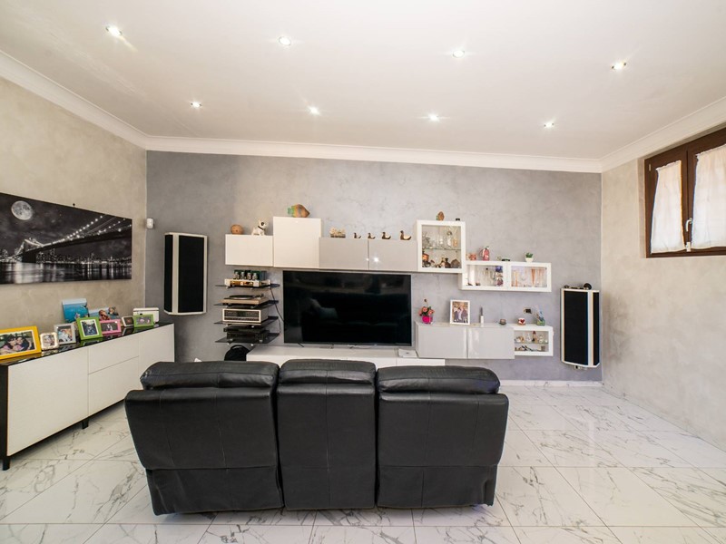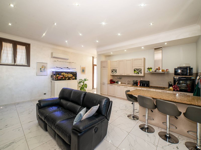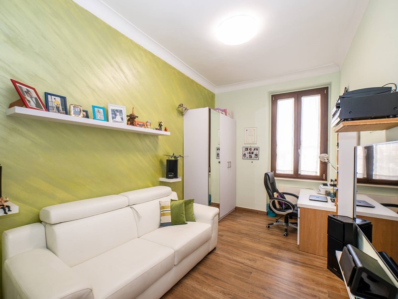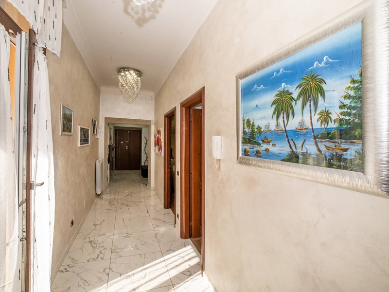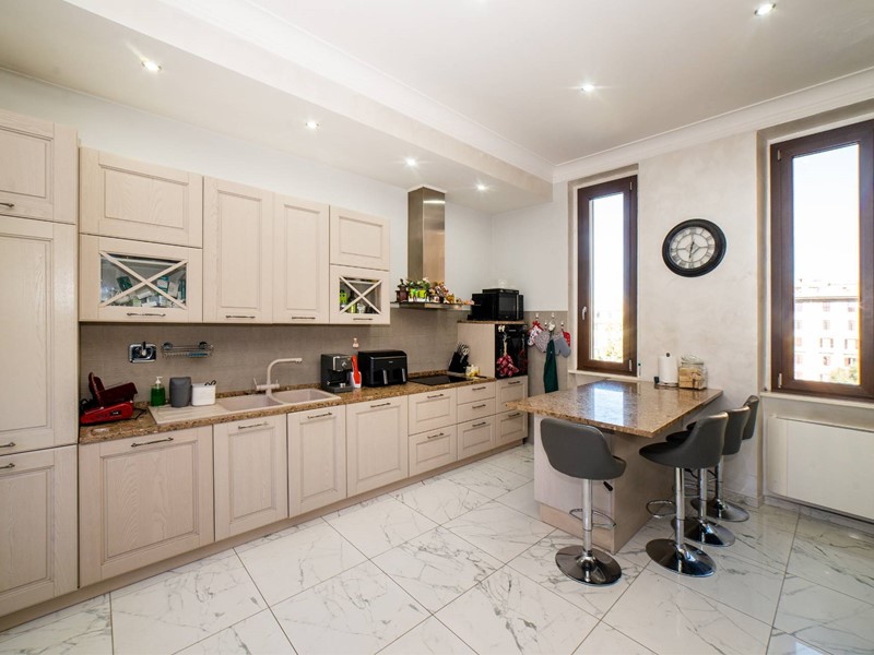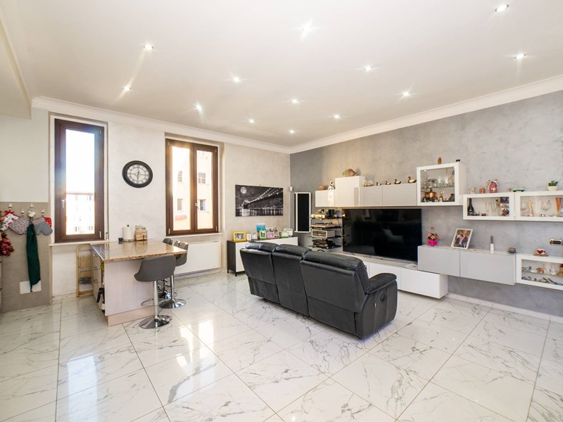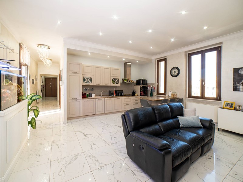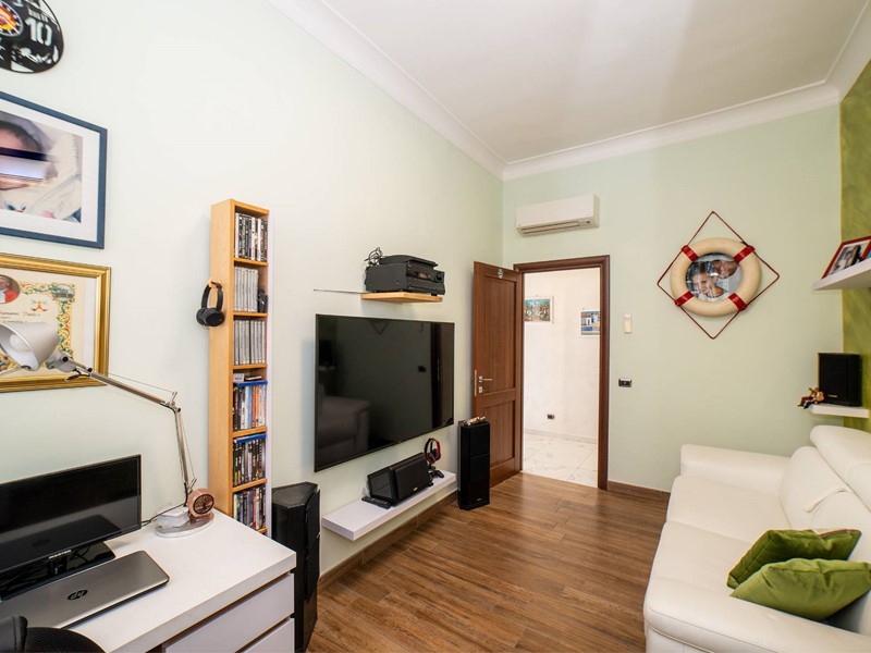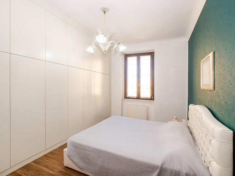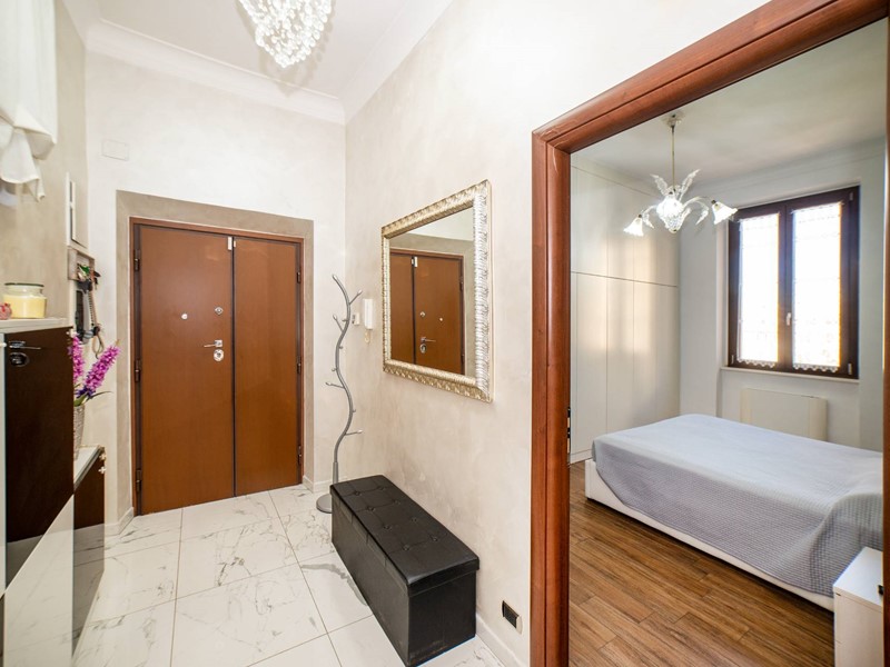 Allinterno dellappartamento sono stati posati pavimenti di prima qualità come lastre di gres porcellanato levigato simil marmo nella zona giorno e listoni in gres porcellanato tipo parquet nelle camere da letto. In una delle camere si trova un grande armadio a muro fatto su misura.