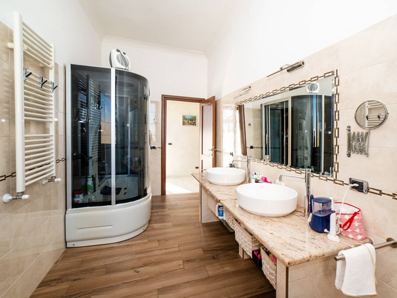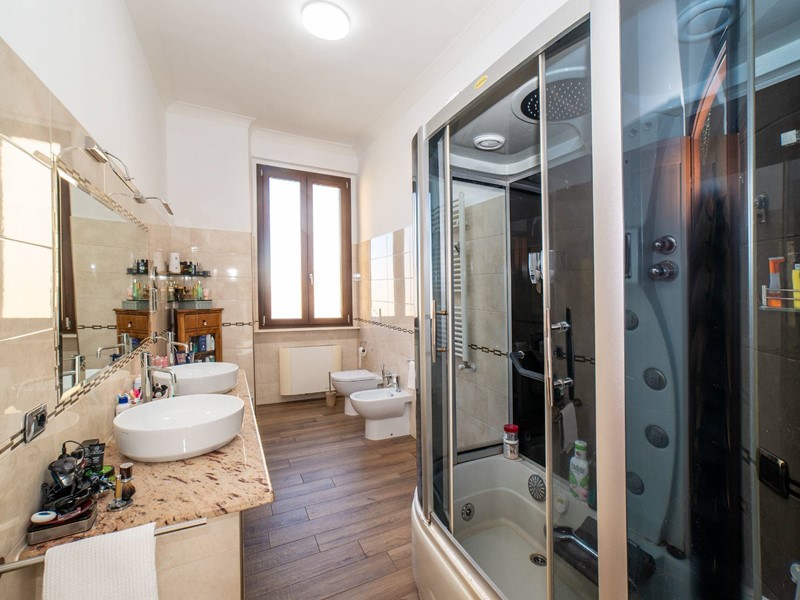 Lampio bagno presenta un mobile con doppio lavabo e una vasca idromassaggio cabinata allinterno della quale cè anche lidromassaggio verticale per una doccia rigenerante.