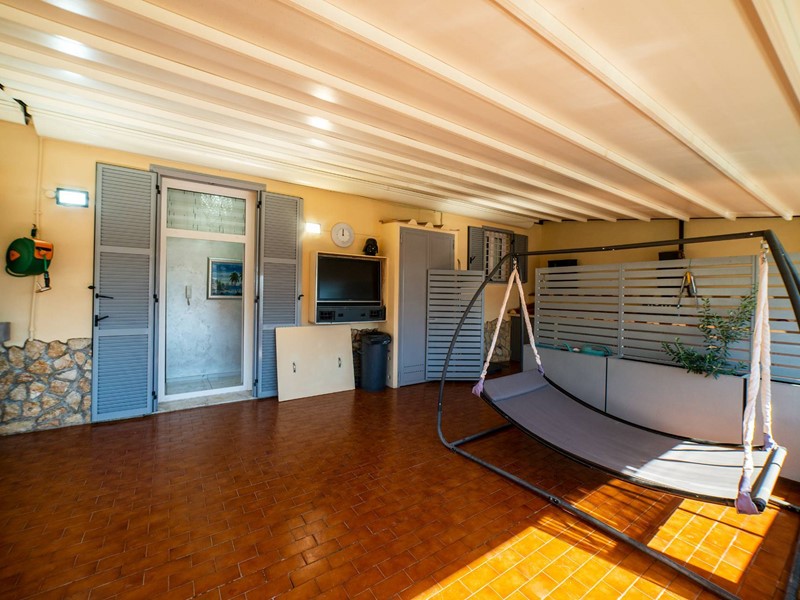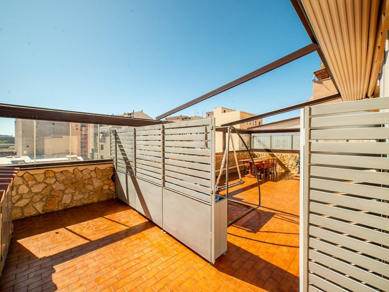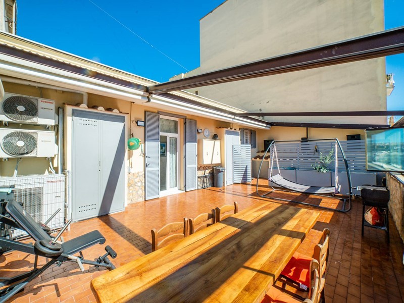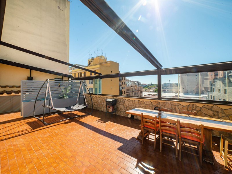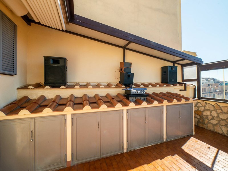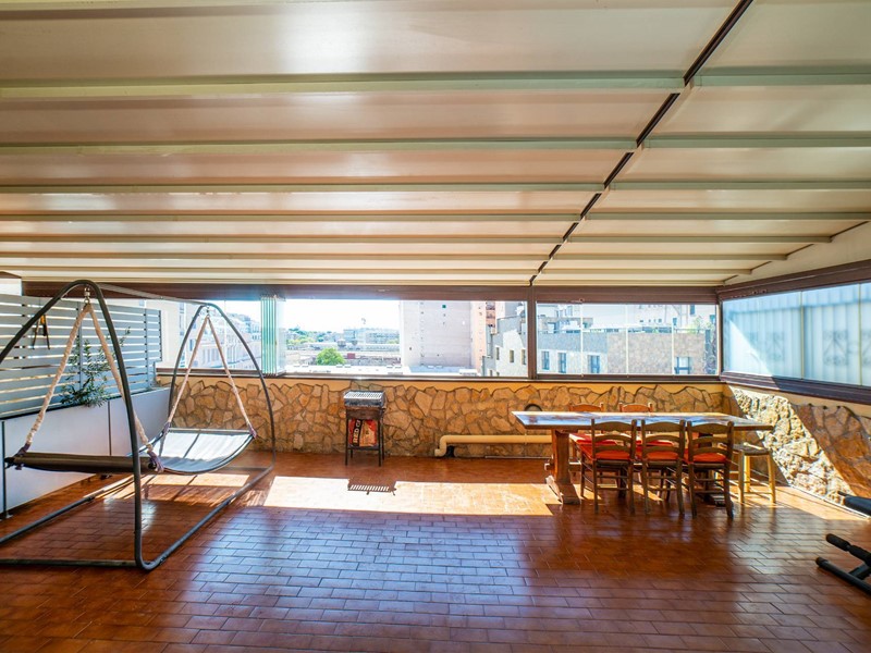Entrando limmobile si sviluppa attraverso un ampio ingresso e corridoio finestrato sui quali si affacciano, sulla sinistra, le camere da letto e il bagno e a destra lo splendido terrazzo, fulcro dellimmobile. Proseguendo ci si ritrova in un ampio salone con una cucina a vista. Questo, ambiente principale della casa, gode di luce naturale tramite tre finestre, di cui una dà accesso al magnifico terrazzo di 66 mq, vivibile anche dinverno. La proprietà, infatti, ha cercato di sfruttare al massimo le potenzialità di questa area scoperta installando su tutta la superficie due Pergotenda elettriche, indipendenti tra loro, che permettono la vivibilità anche nei mesi più freddi. Lungo il muretto è stata installata una struttura a vetri pieghevoli che permette comunque laffaccio, ma che consente, una volta chiuse, insieme alle Pergotende, di creare un ambiente protetto dal freddo. Sono inoltre stati montati due split per laria calda/fredda e una grande tv.
