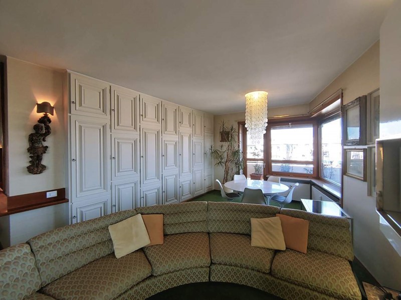 L’attico è così composto: ingresso su ampio soggiorno con angolo bar separato dotato di bancone, cucina abitabile attrezzata, 3 camere da letto e doppi servizi uno con vasca.