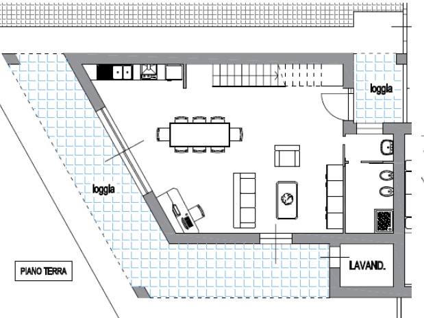 L'abitazione è composta al piano terra da un'ampia zona giorno con soggiorno-pranzo con angolo cottura open space corredata da due ampie porte finestre che affacciano sul giardino circostante. Completano il piano un bagno finestrato con doccia e la zona lavanderia, quest'ultima accessibile dall'esterno, oltre ad un ampio porticato.