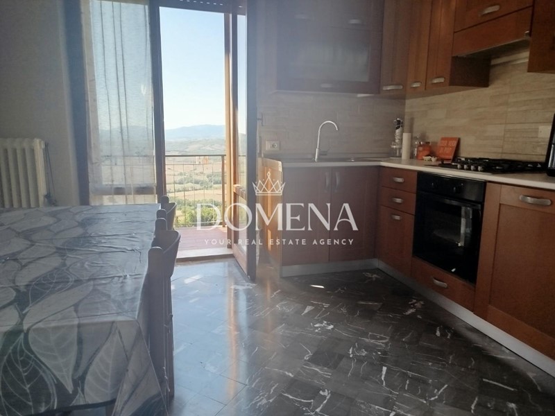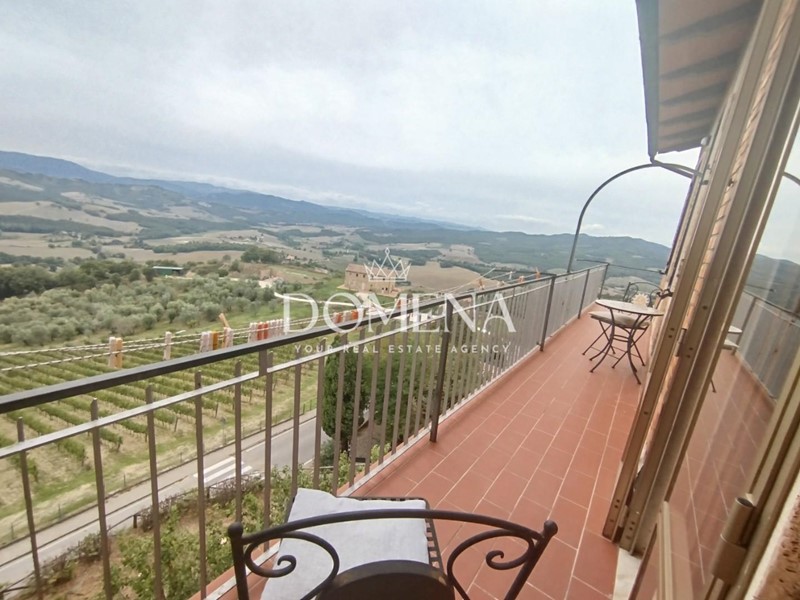 Al secondo e ultimo piano di una palazzina storica, si apre un mondo di **120 mq di charme toscano**, abbracciato dalla luce naturale e affacciato su **una delle viste più poetiche della campagna senese**: da un lato, le morbide colline dorate che si rincorrono all’orizzonte, dall’altro, i tetti in cotto e le pietre vive dell’antico borgo, custode di secoli di storia.