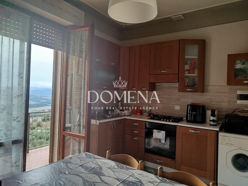 Gli spazi interni sono ampi, ariosi, pensati per accogliere momenti di vita vera. Un ingresso con corridoio introduce alla **cucina con accesso diretto a un terrazzino panoramico**, dove il caffè del mattino profuma di silenzio e bellezza. La zona giorno è un salone luminosissimo, ideale per serate in compagnia o per leggere un libro mentre il sole tramonta sulle colline.