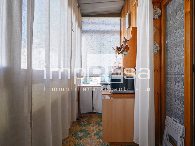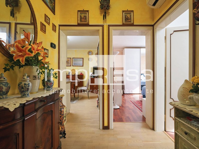 L' ingresso dell' appartamento si apre su un comodo disimpegno che ci conduce a tutte le altre stanze, tra cui troviamo la cucina con sala da pranzo e veranda, una camera matrimoniale di generose dimensioni, un' altra camera attualmente adibita a soggiorno e un ampio bagno finestrato con doccia.