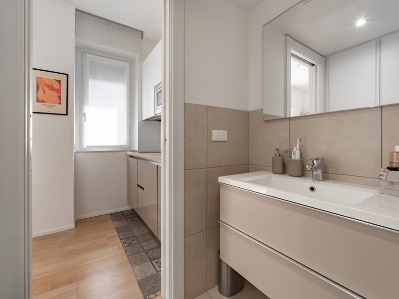 Completa l'appartamento il bagno, che si presenta in perfette condizioni ed un ampio balcone con affaccio interno. L' immobile è fornito di aria condizionata e riscaldamento centralizzato.