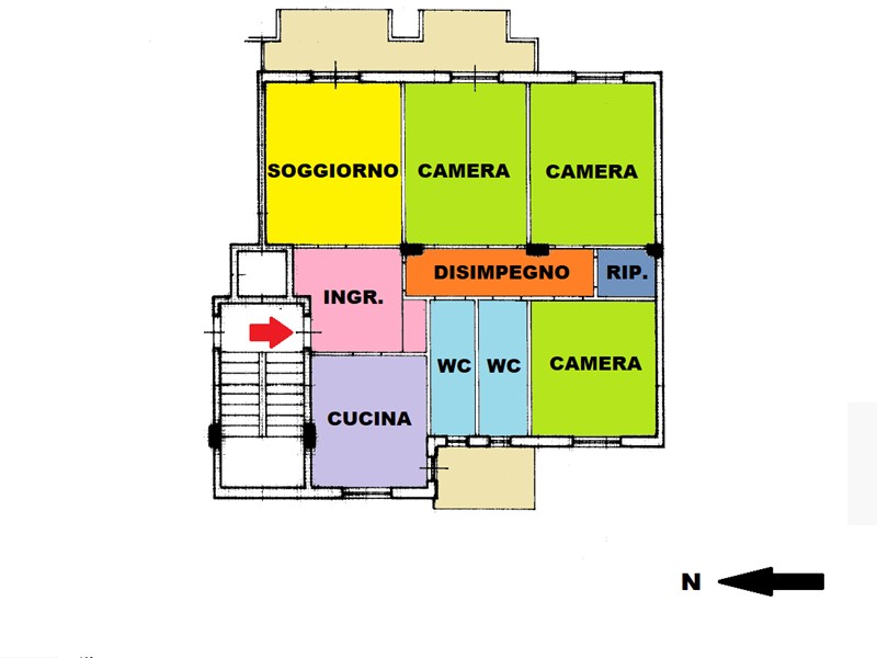 L'immobile è composto da un ingresso con armadio a muro, soggiorno, cucina, disimpegno, tre camere da letto, due bagni ed un ripostiglio. Le balconate terrazzate offrono un'ottima esposizione est-ovest, garantendo una piacevole luminosità in ogni momento della giornata.