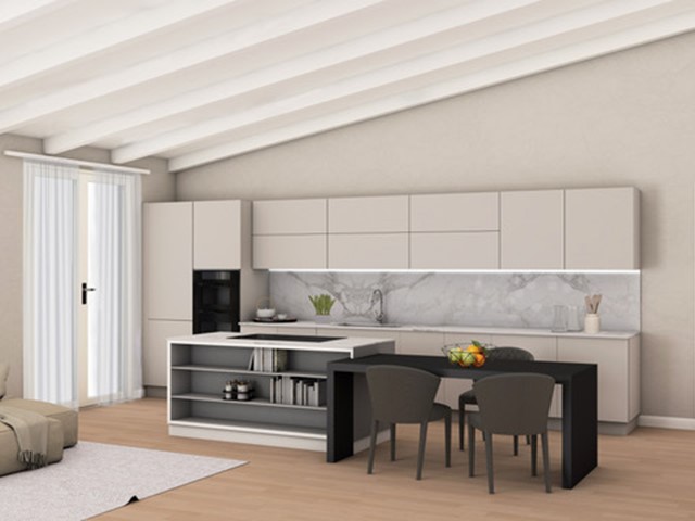 L'immobile è composto da ampio soggiorno, cucina a vista con affaccio sul patio, ideale per cene estive e relax immersi nel verde.