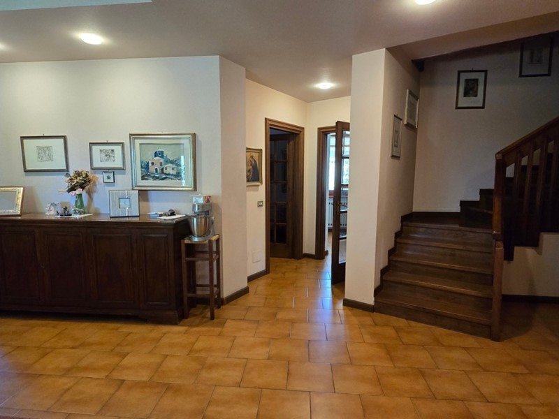 Al primo piano troviamo un ampio disimpegno con accesso al terrazzo con vista sulle colline, una camera matrimoniale, anch'essa con accesso al terrazzo, due bagni e altre due camere matrimoniali.