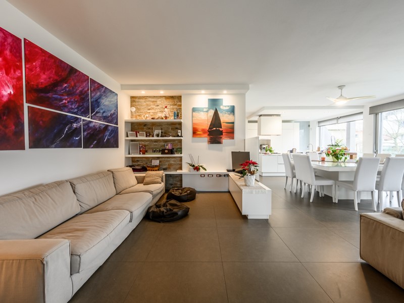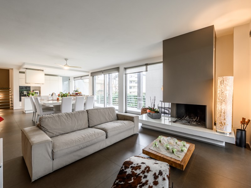 Il piano terra ospita la grandissima zona giorno con il soggiorno doppio diviso in area pranzo, due zone living e cucina all’americana a vista con dispensa; tutto l’ambiente si presenta particolarmente luminoso grazie alla scelta di realizzare grandi vetrate che occupano interamente due pareti e che si affacciano sul patio e sul giardino. Sullo stesso livello troviamo un bagno di servizio e ripostiglio.
