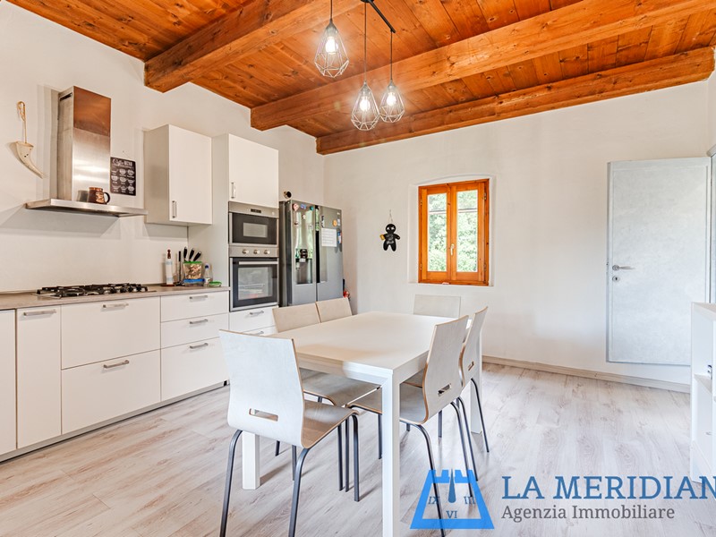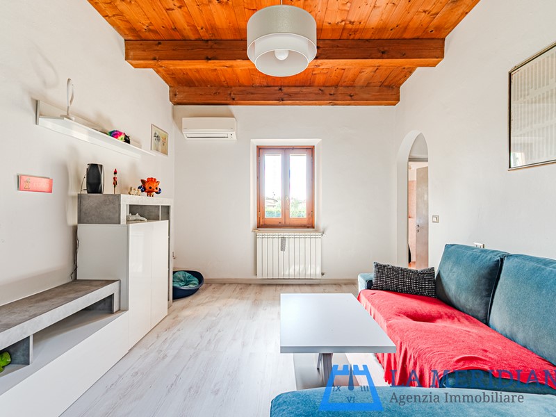 piano terra: soggiorno con travi in legno bianco e loggiato frontale, inoltre composta da altro locale pluriuso sempre con travi e mezzane in cotto, bagno finestrato e locale lavanderia/caldaia.