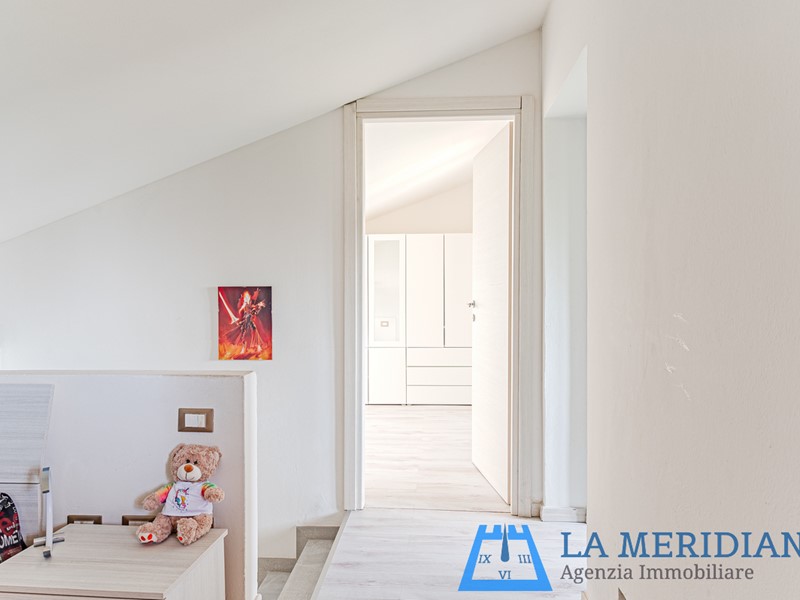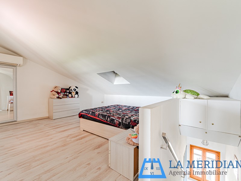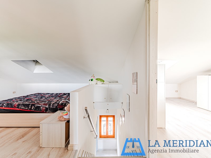 piano mansardato: camera per ospiti, piccolo soggiorno e bagno finestrato con doccia.