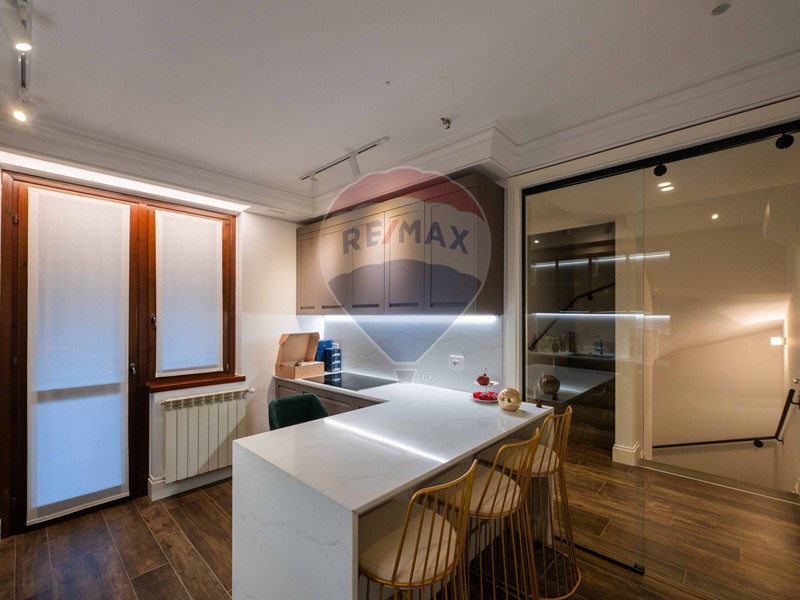 La porta d'ingresso conduce alla zona giorno suddivisa in cucina abitabile e di design e con elettrodomestici di ultima generazione.