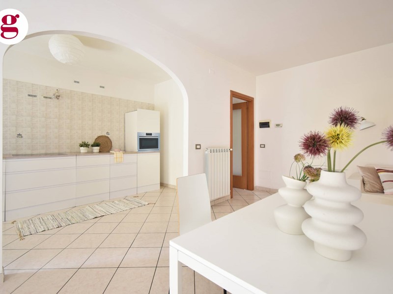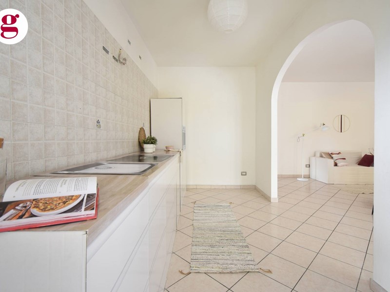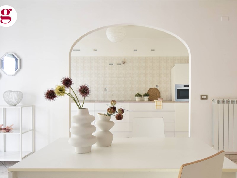 La cucina a vista leggermente nascosta da una tramezzatura, è perfetta per preparare deliziose cene in compagnia o per godersi momenti di relax in famiglia.