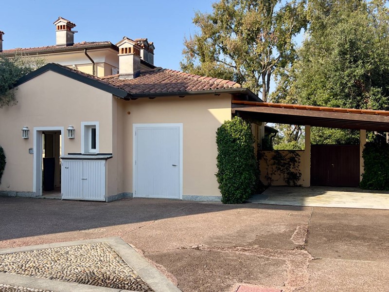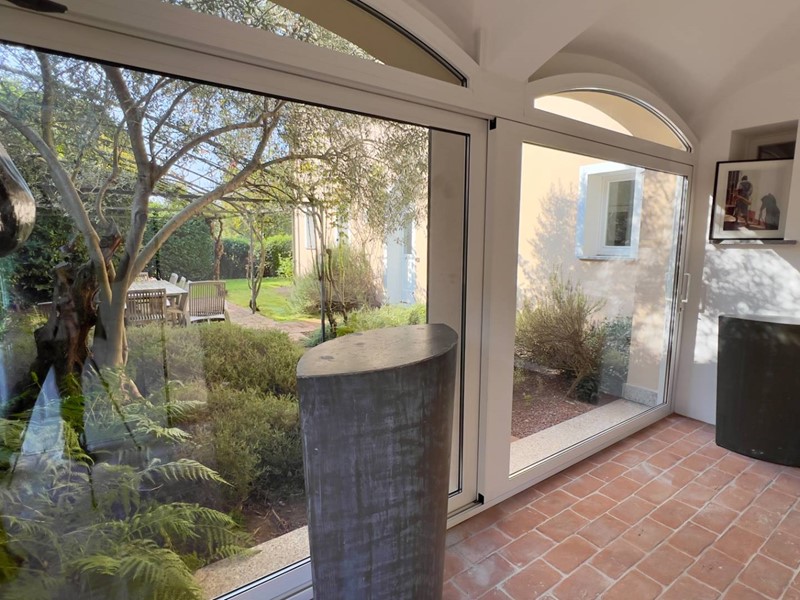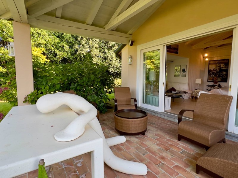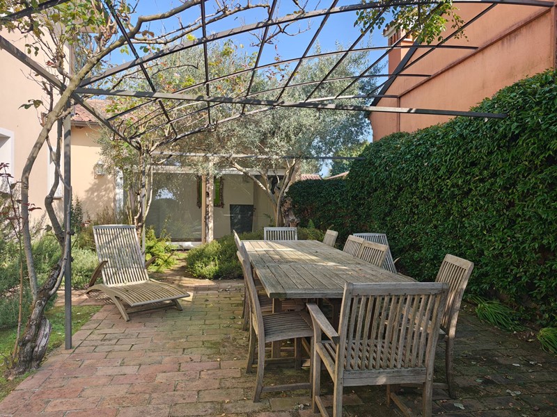 Allesterno, la villa si apre su un ampio giardino privato, unoasi di quiete e natura, perfetta per godere del ritmo lento delle giornate. Un grande patio coperto e una zona pranzo allaperto offrono spazi ideali per vivere lesterno in ogni stagione, ammirando la vista panoramica che abbraccia i colli e i campi del Golf Club.