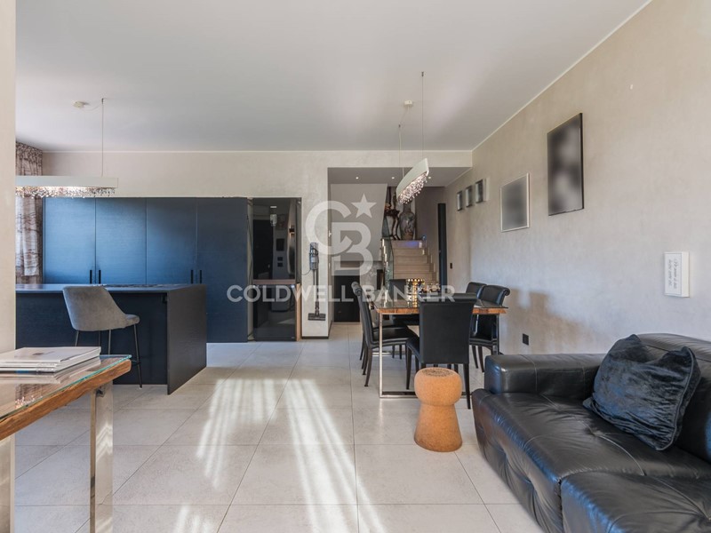 Al piano terra si trova una luminosa zona living con cucina a vista e accesso diretto al balcone, una camera da letto, garage con zona lavanderia e bagno di servizio.