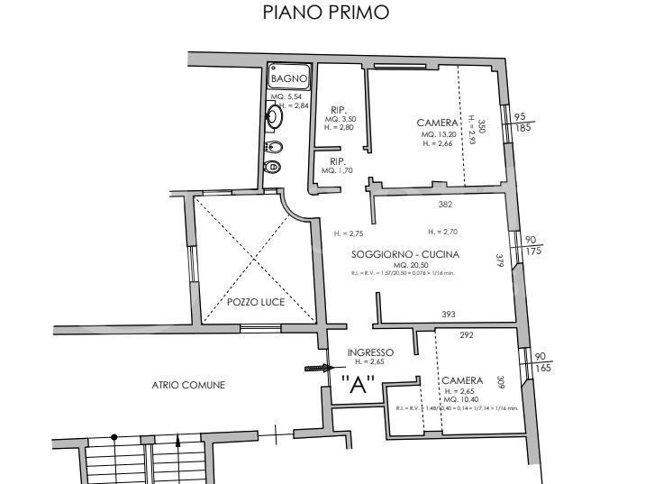L'appartamento, di circa 65 mq, si trova al primo piano ed è composto da soggiorno con angolo cottura, due camere, un bagno e un comodo ripostiglio.